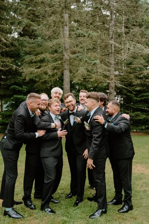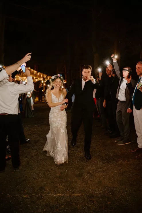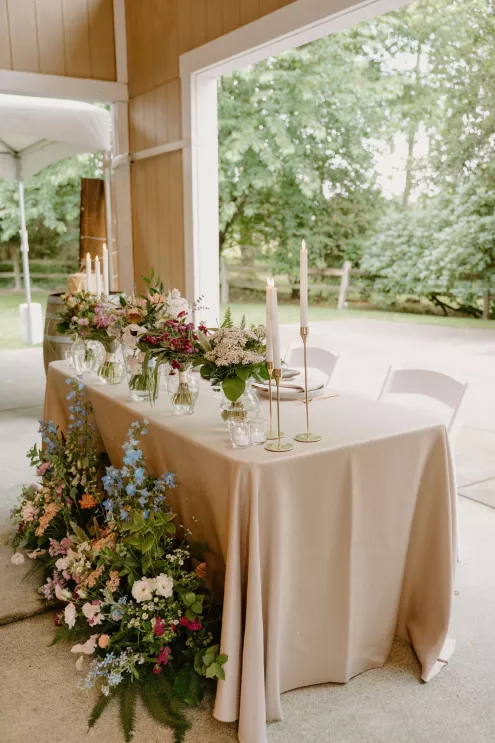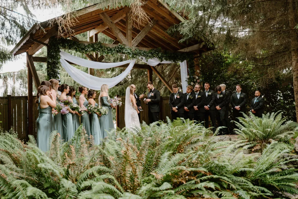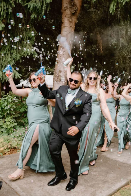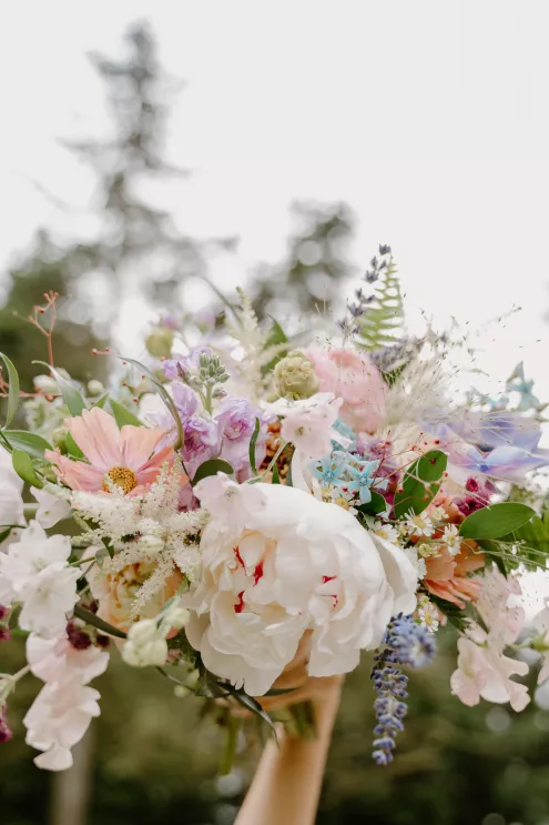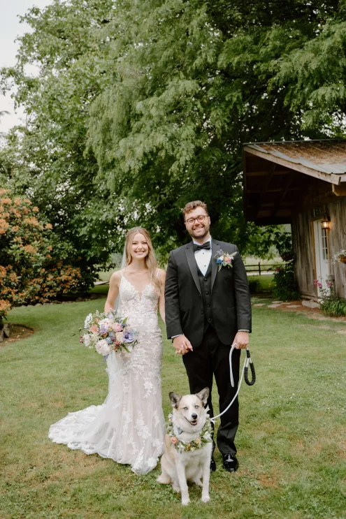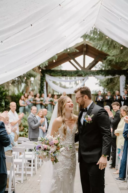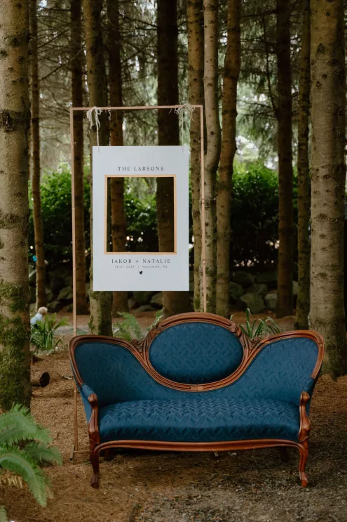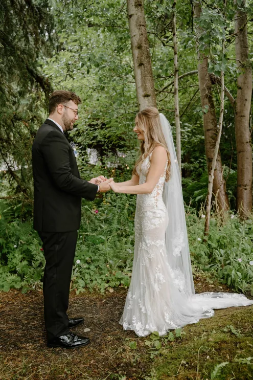 From the moment Natalie met Jakob, she knew she would marry him. Just as predicted, the pair began their happily ever after on the lush, wooded grounds of Woodland Meadow Farms in a romantic celebration that reflected the enchanting beauty of the Pacific Northwest. Under a sheer A-frame tent adorned with a mix of soft lavender and blue florals that contrasted with the surrounding forest, Natalie and Jakob exchanged vows and rings—hers a dazzling display of diamonds; his a band engraved inside with “our highest high.” Post-ceremony, guests kicked up their heels with libations from a playful (and very PNW) wall of champagne and Rainier beer and enjoyed the great outdoors in a curated lounge area tucked within the trees. The day was grounded in thoughtful touches, including seed packets symbolizing growth at each place setting (culled from the bride’s grandmother’s garden), and an unexpected shower of Pokémon cards in lieu of the traditional bouquet toss. As the sun set, the glow of string lights beckoned guests to the dance floor, which, thanks to a few late-night offerings of Krispy Kreme doughnuts and well-crafted cocktails, was jam-packed until evening’s end.
