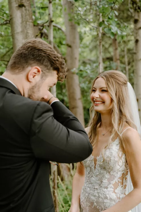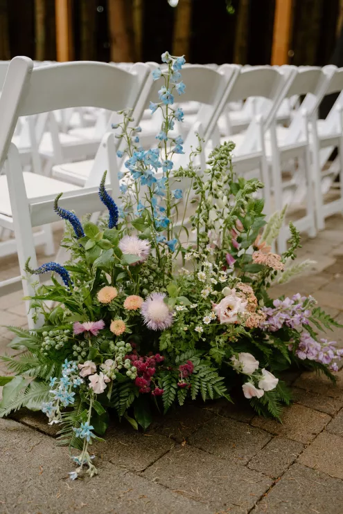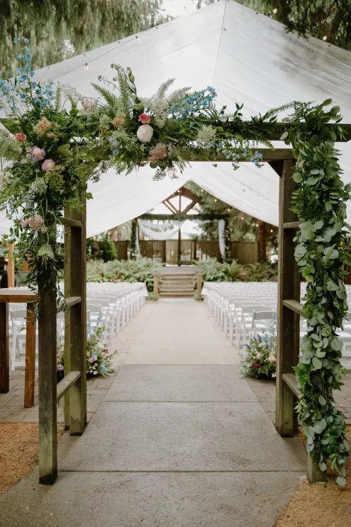 Under a sheer A-frame tent adorned with a mix of soft lavender and blue florals that contrasted with the surrounding forest, Natalie and Jakob exchanged vows and rings