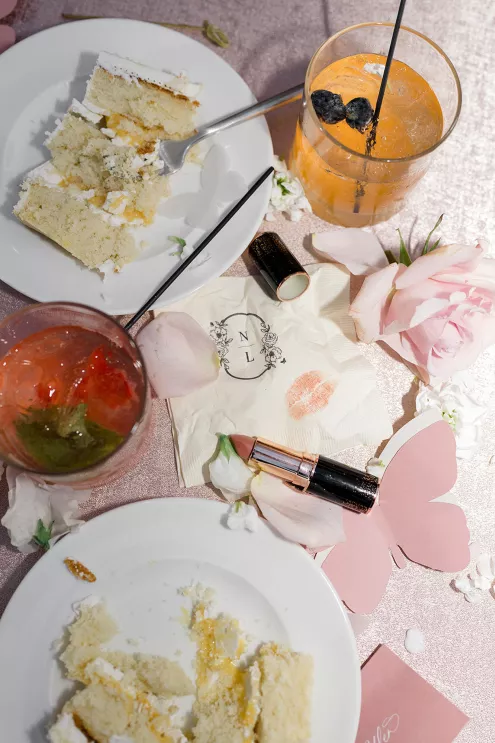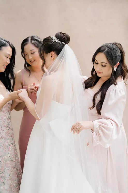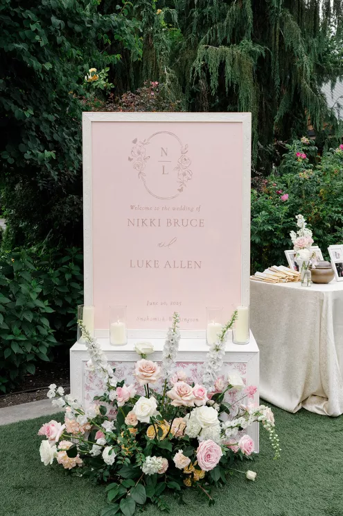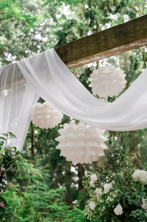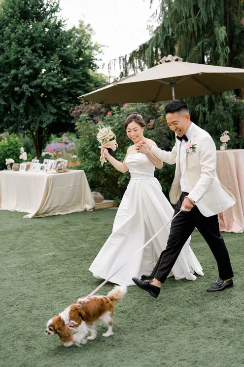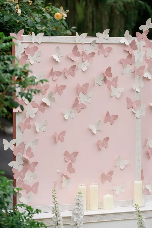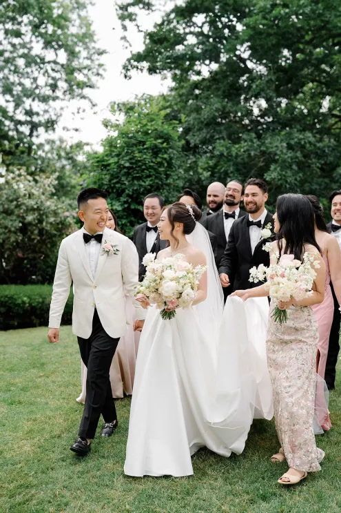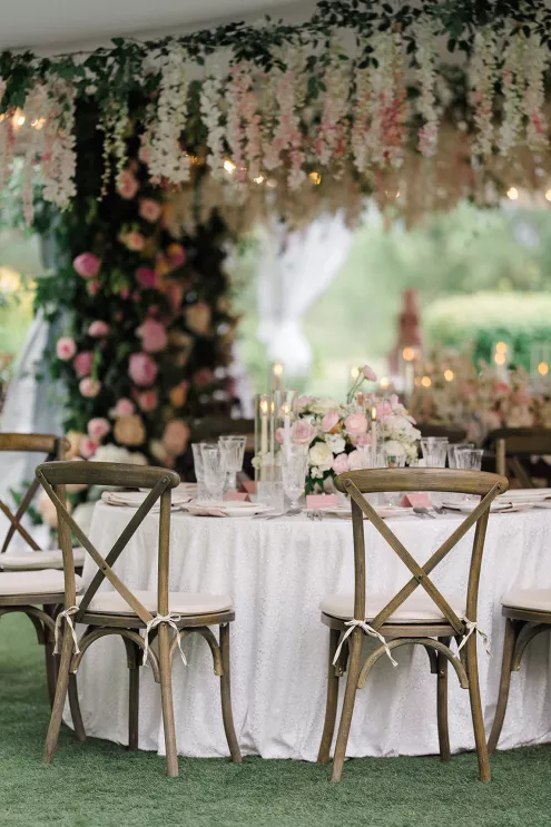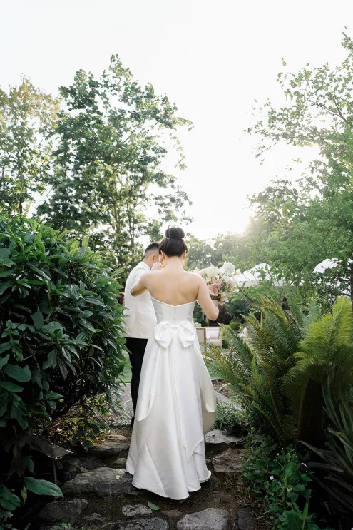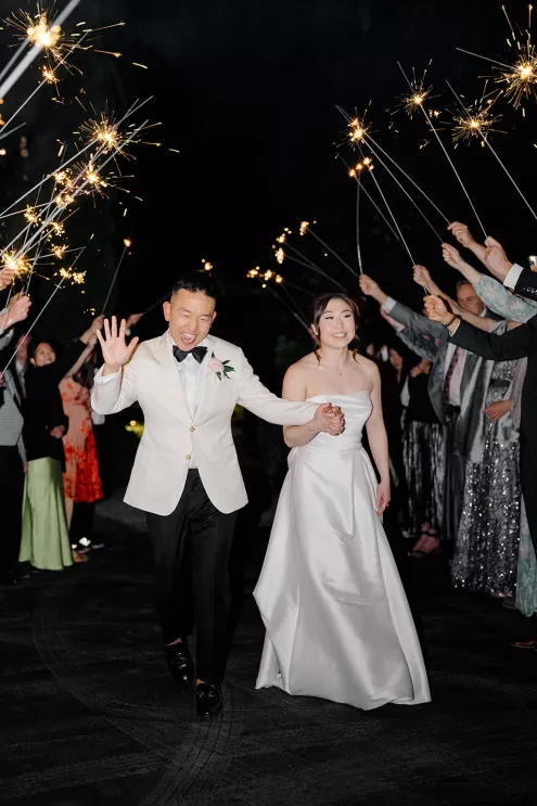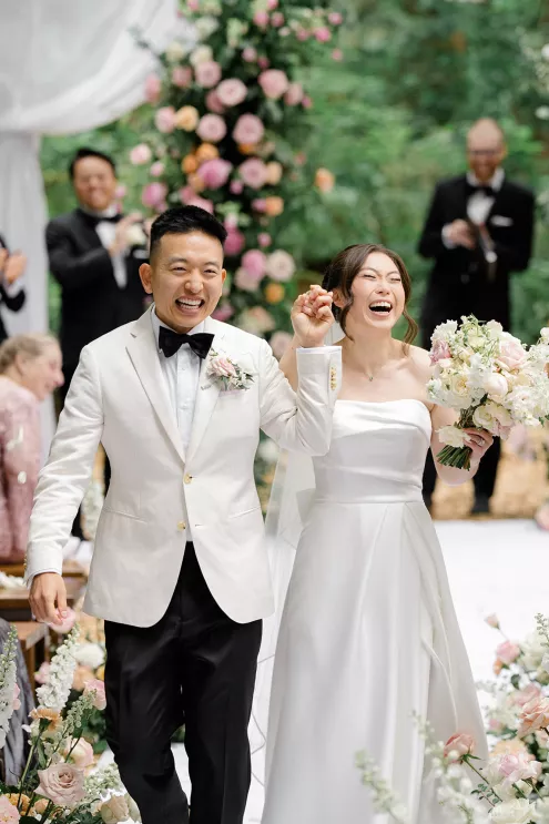 In Korean culture, butterflies represent love, harmony and new beginnings—the perfect symbol for Nikki and Luke’s opulent wedding day. Their vision came to life at the charming Twin Willow Gardens, where elegant floral displays of roses, snapdragons and peonies, along with dreamy draping, created a fairytale-like setting within the forest. Geometric paper lanterns hung over the altar, adding even more richness and texture, while the couple exchanged their affirmations of love. To honor their heritage, they incorporated elements of Korean culture throughout, including a pink escort card wall filled with custom-cut paper butterflies in flight, table numbers displayed in English and Korean, a Korean soju toast, a tiered cake embellished with sugar butterflies and a menu of delicious delicacies like spicy miso-marinated salmon, kimchi fried rice and a late-night ramen bar. During the reception, Nikki and Luke encouraged their guests to play a rousing game of Kan Jam, a flying disc game similar to ultimate frisbee, which just so happened to be a game they both love and where they first crossed paths.