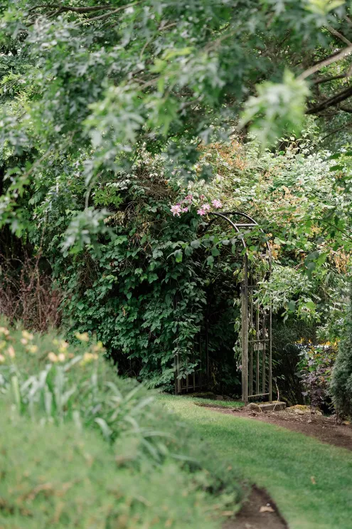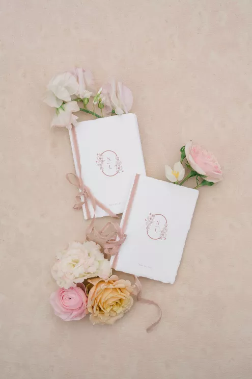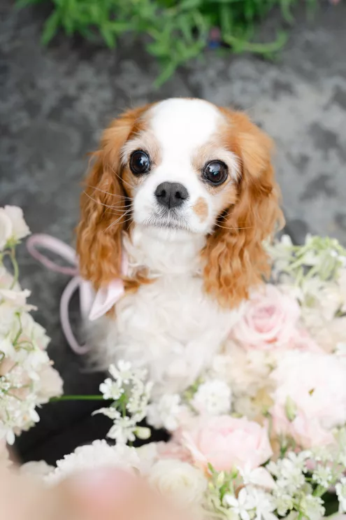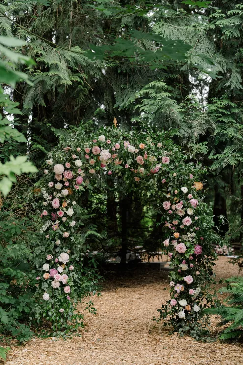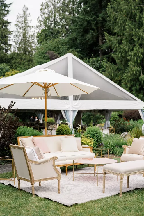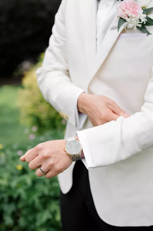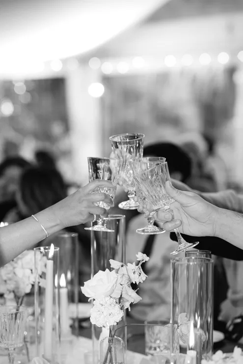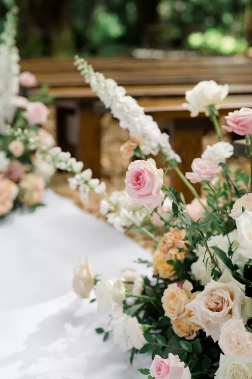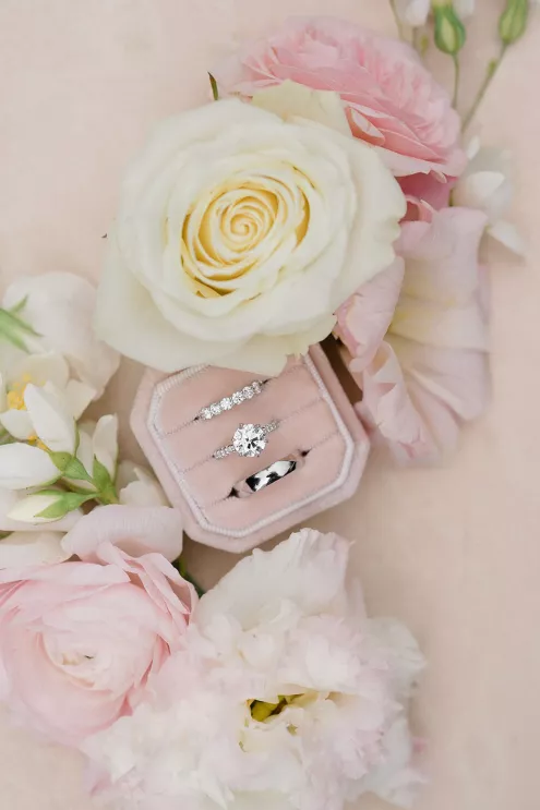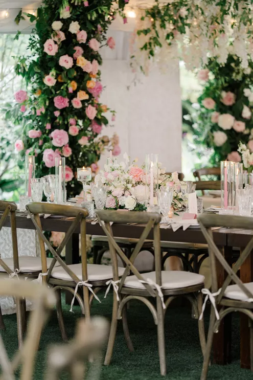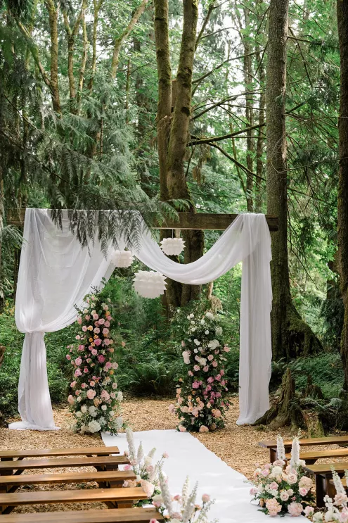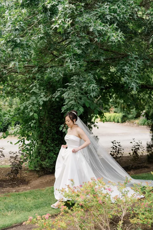 In Korean culture, butterflies represent love, harmony and new beginnings—the perfect symbol for Nikki and Luke’s opulent wedding day. Their vision came to life at the charming Twin Willow Gardens, where elegant floral displays of roses, snapdragons and peonies, along with dreamy draping, created a fairytale-like setting within the forest. Geometric paper lanterns hung over the altar, adding even more richness and texture, while the couple exchanged their affirmations of love. To honor their heritage, they incorporated elements of Korean culture throughout, including a pink escort card wall filled with custom-cut paper butterflies in flight, table numbers displayed in English and Korean, a Korean soju toast, a tiered cake embellished with sugar butterflies and a menu of delicious delicacies like spicy miso-marinated salmon, kimchi fried rice and a late-night ramen bar. During the reception, Nikki and Luke encouraged their guests to play a rousing game of Kan Jam, a flying disc game similar to ultimate frisbee, which just so happened to be a game they both love and where they first crossed paths.