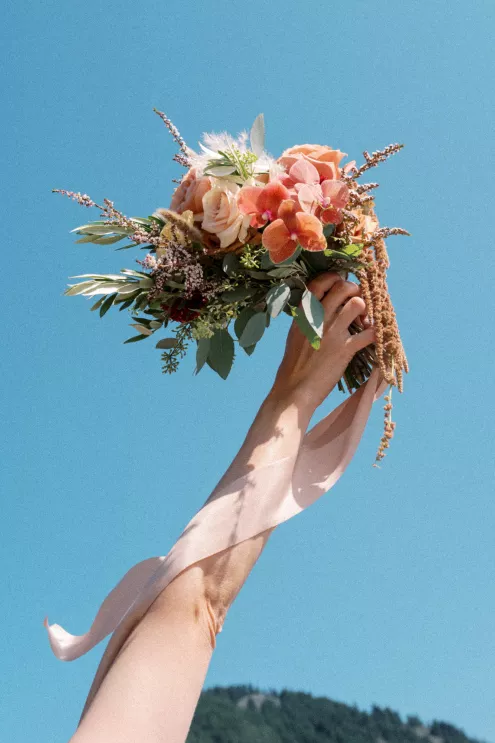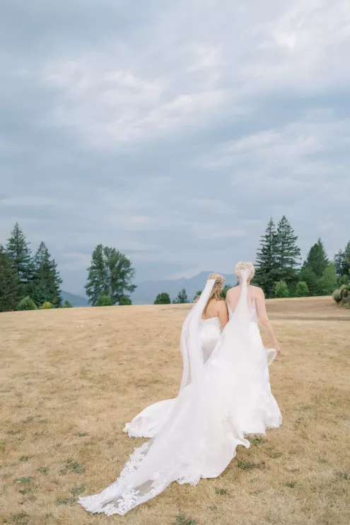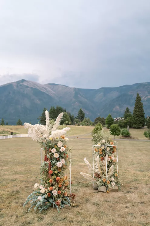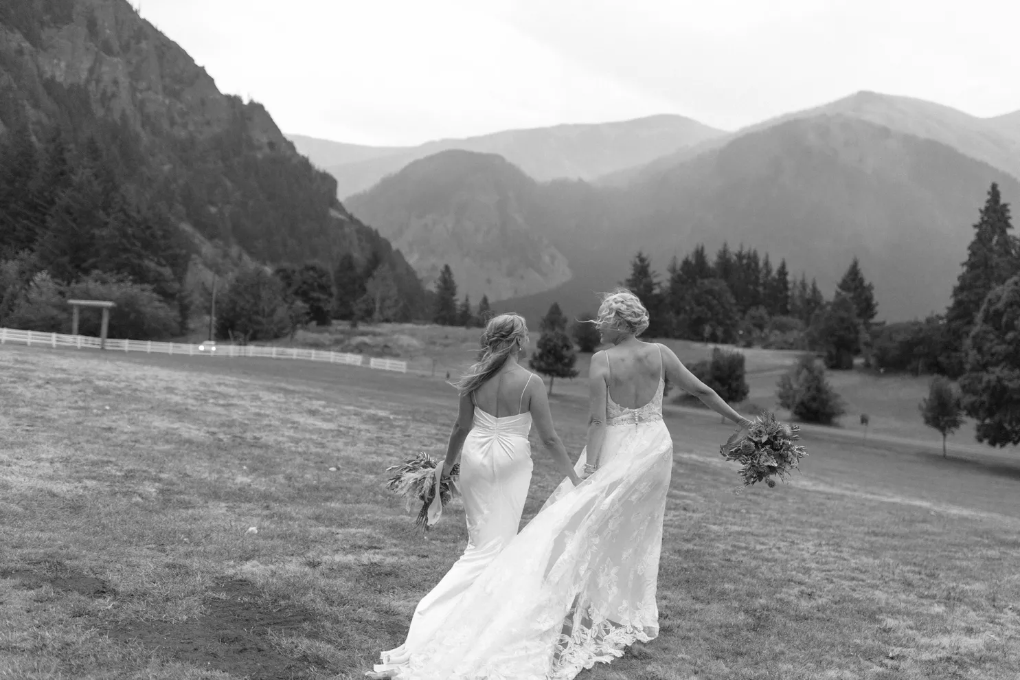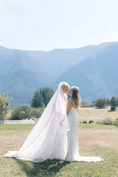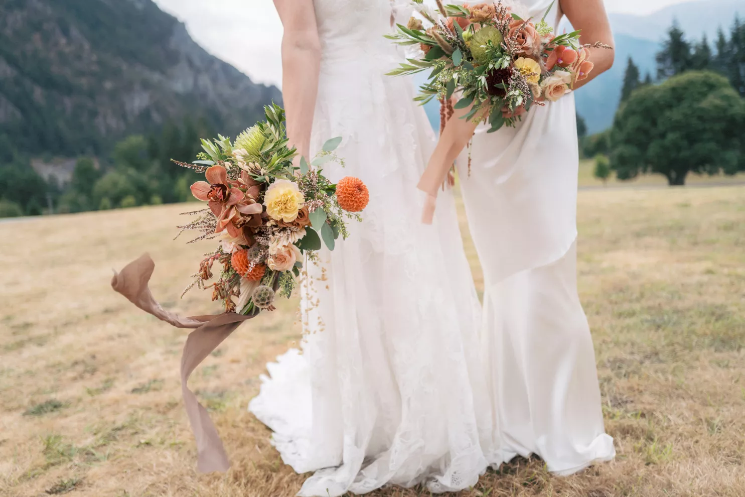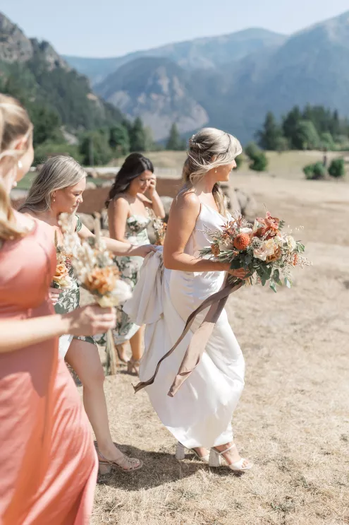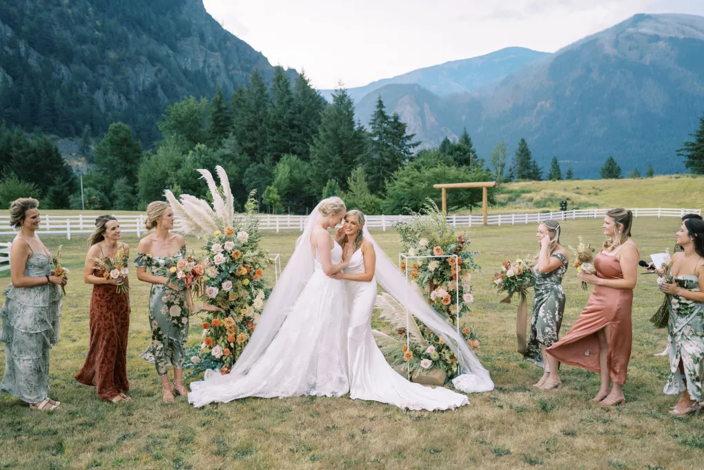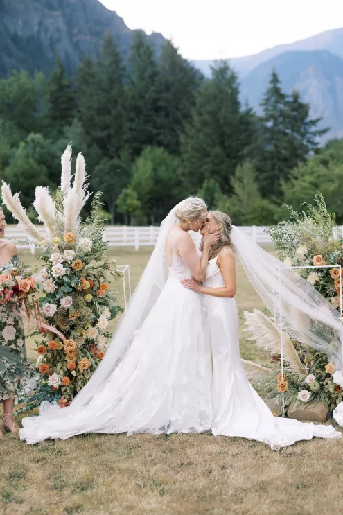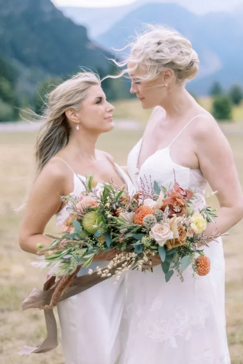 From music venues to mountain peaks, Siri and Brittney have been bonded by connections to special places throughout their love story. One such place was Fine Line, a concert venue in downtown Minneapolis where their hearts linked for the first time. To honor this treasured memory, Siri planned her surprise proposal to Brittney at Fine Line. The couple chose Wind Mountain Ranch, with its mountainous backdrop, as the venue for their destination wedding’s earthy, natural design. The floral arrangements featured a variety of soft, organic colors: corals, pale pinks, whites and light browns. Because the venue experiences strong winds on occasion, the flowers were carefully designed to move beautifully and maintain form on a windy day—and, sure enough, when the wedding day arrived, it featured 90-degree temperatures that led into dark clouds and strong winds immediately after the ceremony. However, Siri and Brittney were not deterred by the chaotic weather. Instead, they embraced it and bonded with their guests over unpredictable circumstances, creating memories they will cherish forever.