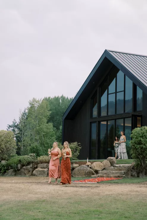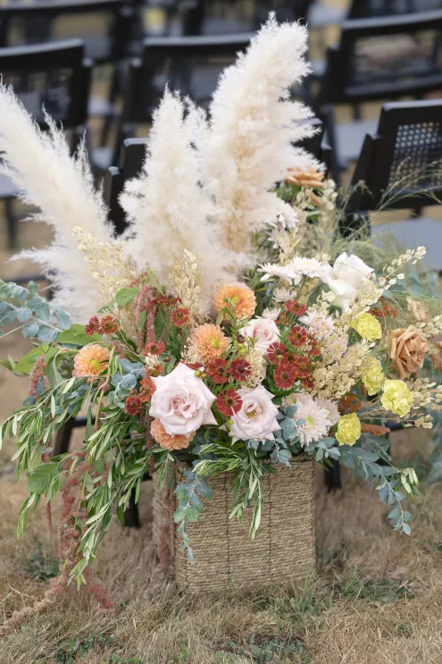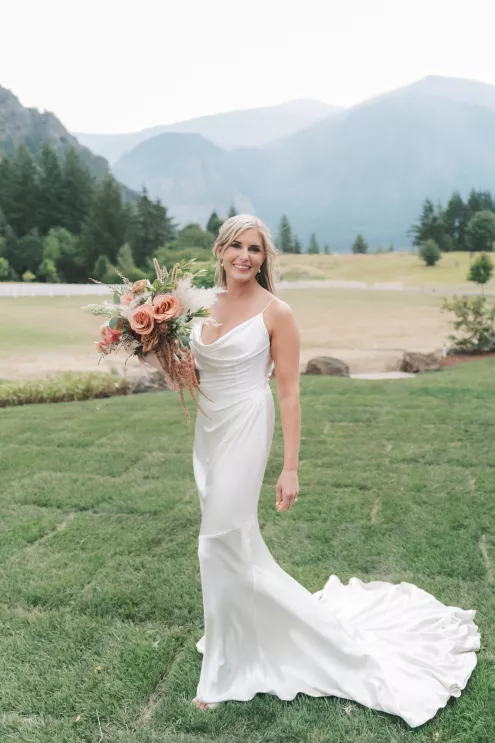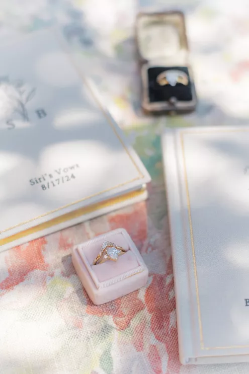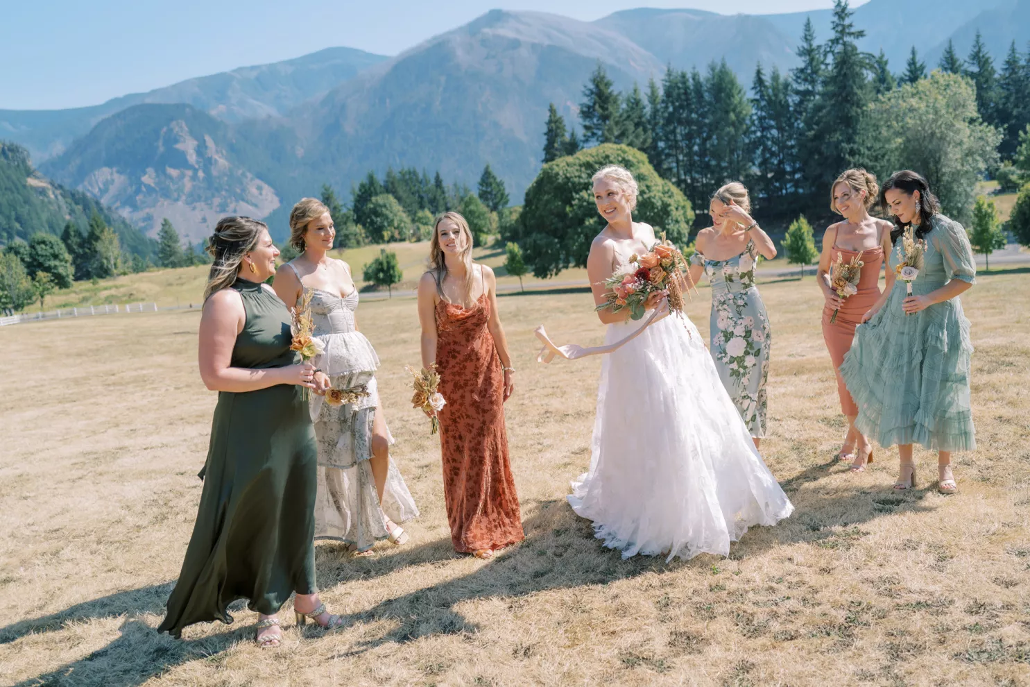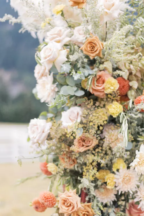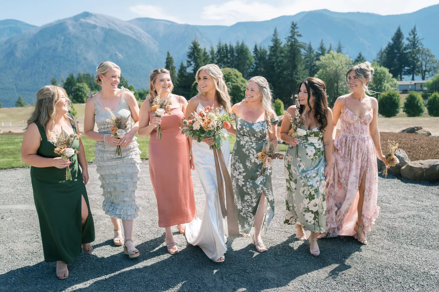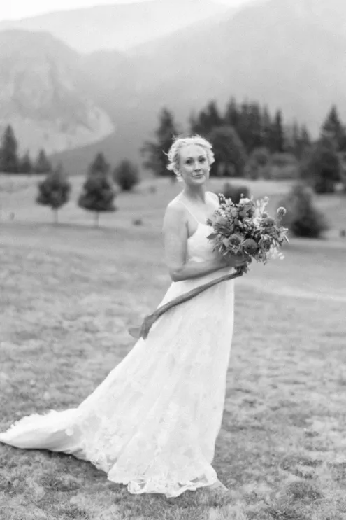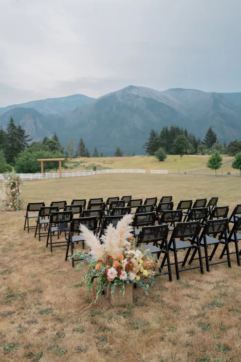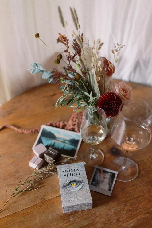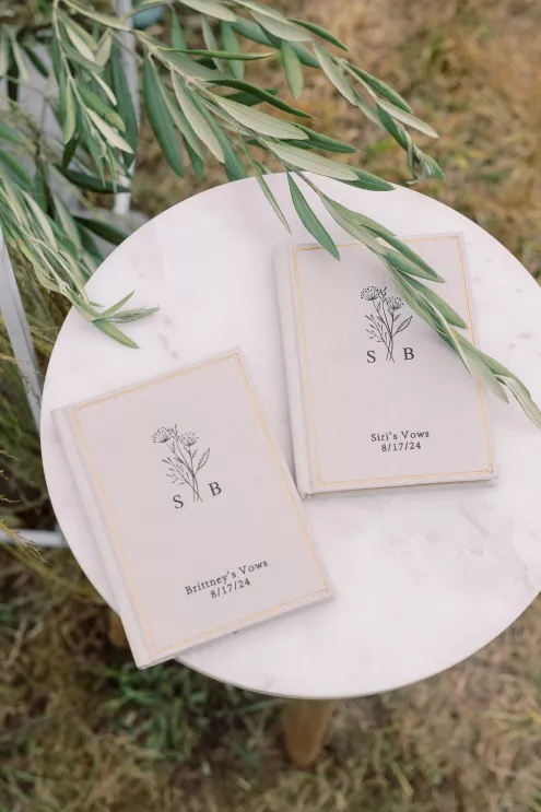 From music venues to mountain peaks, Siri and Brittney have been bonded by connections to special places throughout their love story. One such place was Fine Line, a concert venue in downtown Minneapolis where their hearts linked for the first time. To honor this treasured memory, Siri planned her surprise proposal to Brittney at Fine Line. The couple chose Wind Mountain Ranch, with its mountainous backdrop, as the venue for their destination wedding’s earthy, natural design. The floral arrangements featured a variety of soft, organic colors: corals, pale pinks, whites and light browns. Because the venue experiences strong winds on occasion, the flowers were carefully designed to move beautifully and maintain form on a windy day—and, sure enough, when the wedding day arrived, it featured 90-degree temperatures that led into dark clouds and strong winds immediately after the ceremony. However, Siri and Brittney were not deterred by the chaotic weather. Instead, they embraced it and bonded with their guests over unpredictable circumstances, creating memories they will cherish forever.