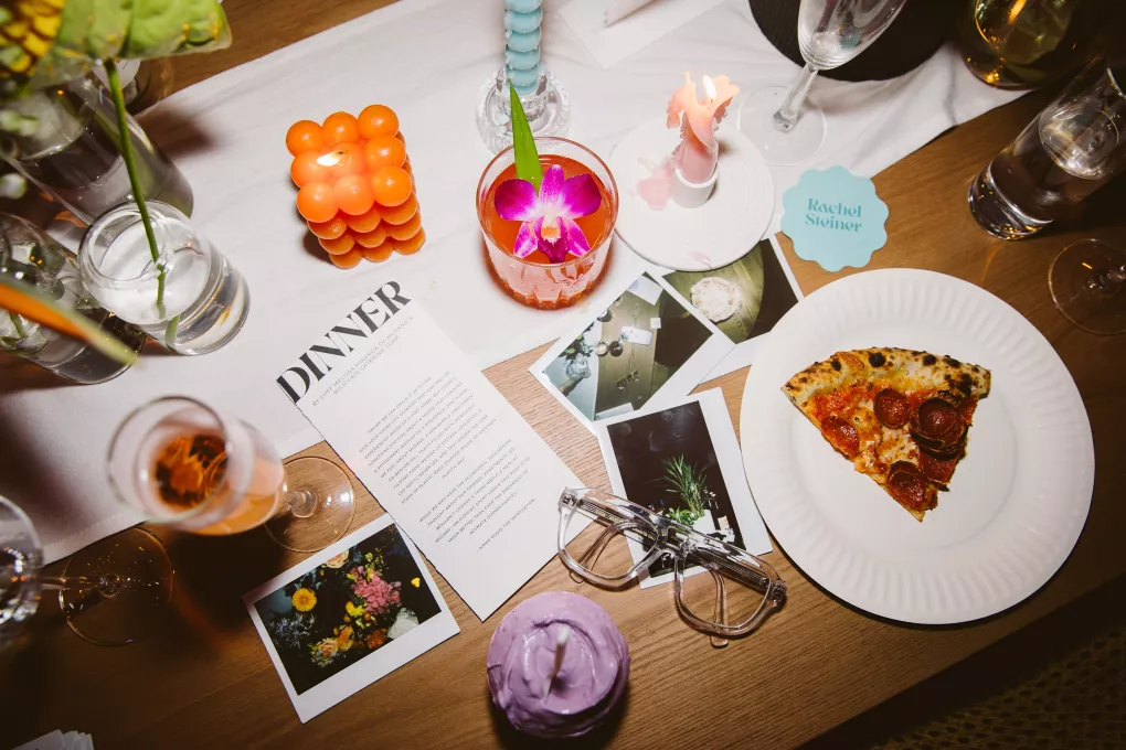 A scattering of details that include the dinner menu, color palette, tabletop details and after-party pizza.