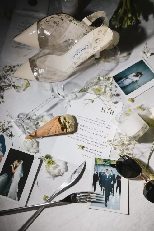 The progression of the day is gathered: invitation, bridal heels, sunglasses, floral buds, dessert and impromptu Polaroids.