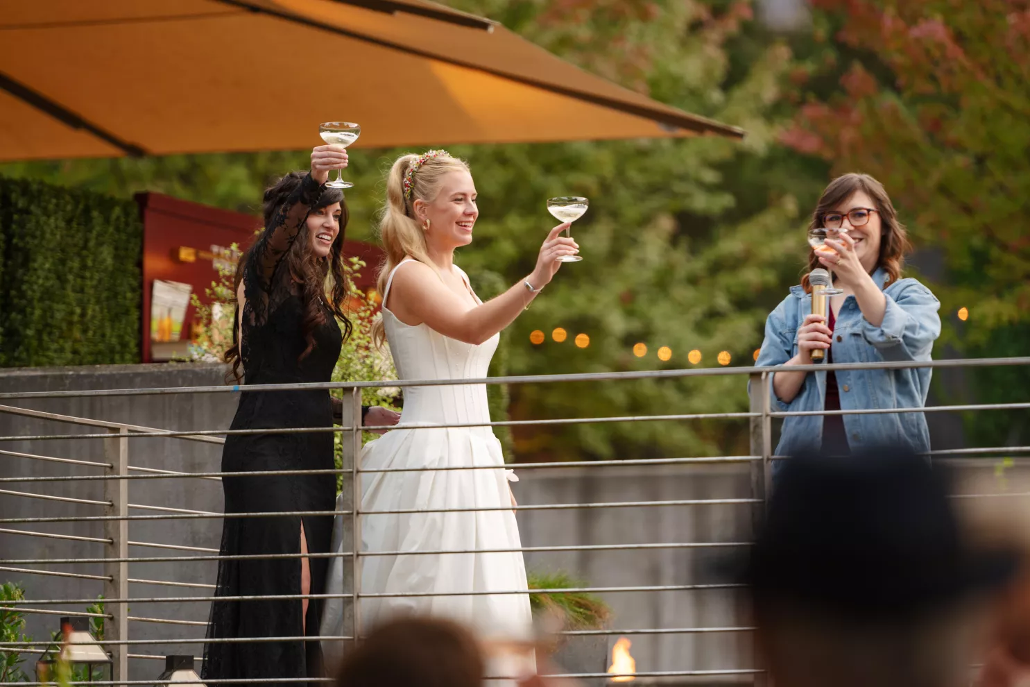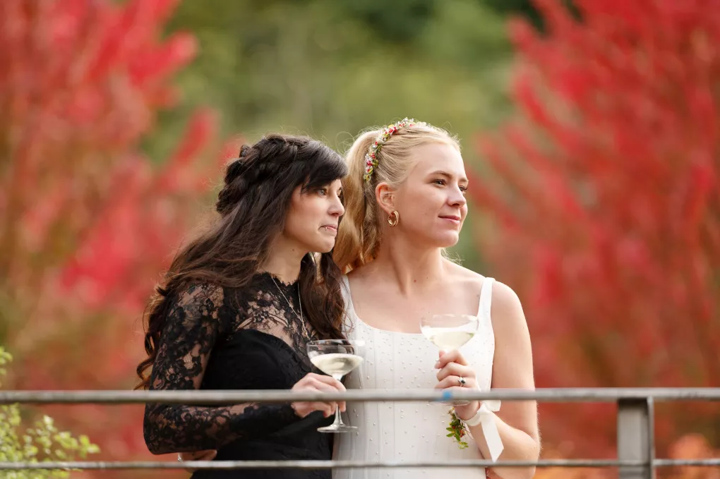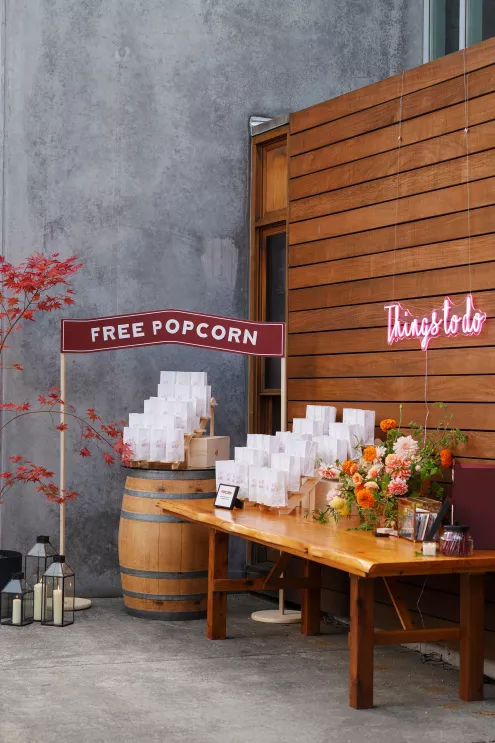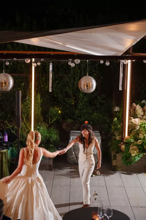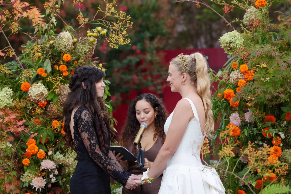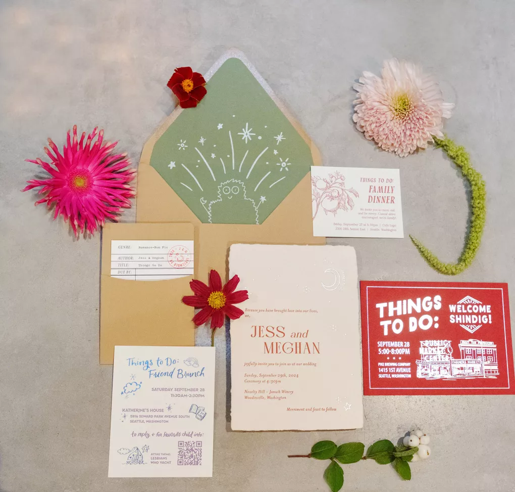 When writers and lovers of the written word, Jess Alberg and Meghan Mock, first met at a New York house party, their connection was instant. But it wasn’t until a tarot card reading at Jess’ house that they realized they were meant to be. While planning their wedding at Novelty Hill–Januik Winery, the pair chose to break traditions at every turn, and, in doing so, splashes of personality were embedded in every aspect of their day. By foregoing a color scheme, the eclectic invitations were fun and fresh with a wide range of fonts, colors and themes. The phrase “Things to do” was included everywhere in the design—particularly the invitations and signage—a reference to the title of the first love poem Jess ever wrote for her bride. Inspiration for the floral arrangements of local stems and fresh produce, including tomatoes and grapes, was drawn from the couple’s sense of fun and desire to have the space overflowing with color and joy. Avid travelers, the couple encouraged their guests to fold and throw paper airplanes during their first kiss, an adventurous detail complemented by postcard save-the-dates and a collection of postcards that served as a creative alternative to a guest book. In addition to a chic library-esque seating chart, a bright orange and maroon drink display featured venue staples and “Meghan Mock-tails,” non-alcoholic drinks with a clever twist on the bride’s last name. Reflecting on their unique, family-driven day, the brides described their celebration as “one big confetti pile of lots of inside jokes, random wants and a whole lotta love.”