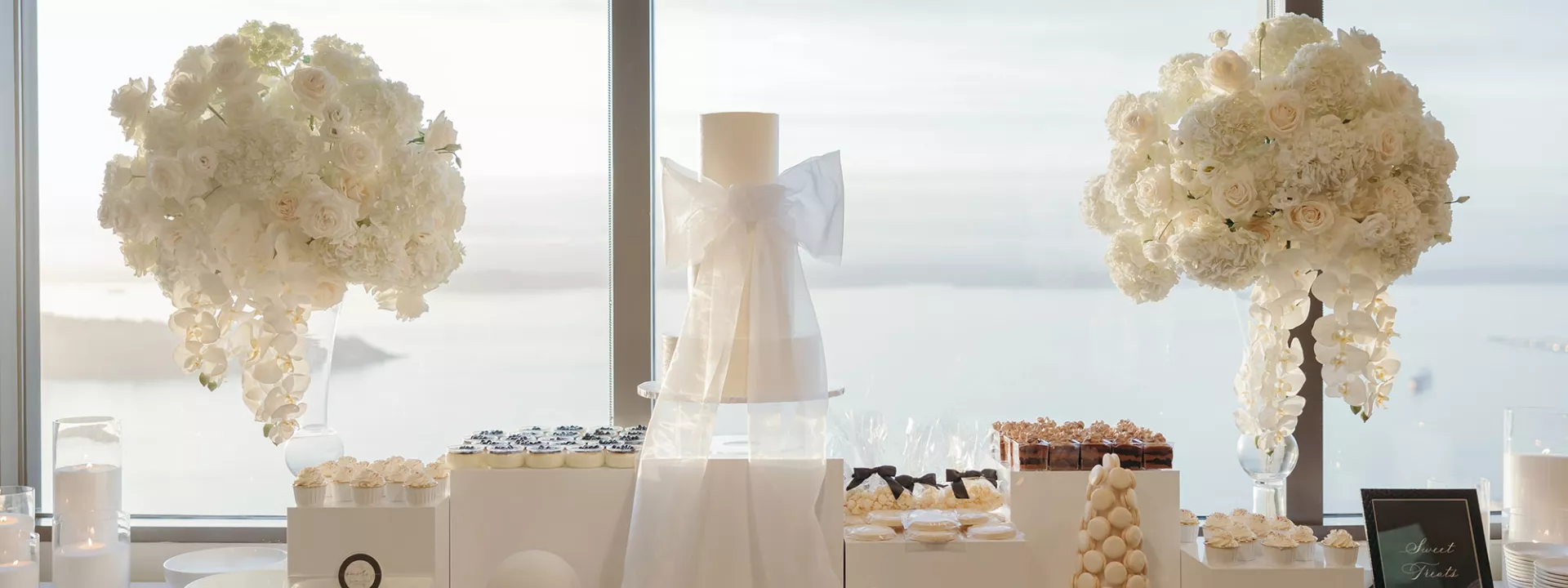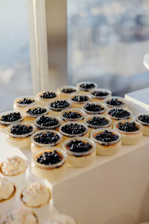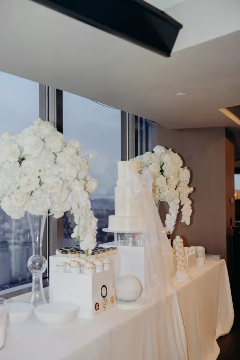 The standout feature of the night was the extravagant dessert display, centered around a multi-tiered cake wrapped in a sheer organza bow to create an ethereal focal point. Surrounding the cake was a curated selection of artisanal confections, including delicate macarons, intricately decorated cupcakes and petit fours. Guests were also treated to freshly shucked oysters and indulgent caviar bumps, a bespoke culinary touch that added a luxe edge to the evening.