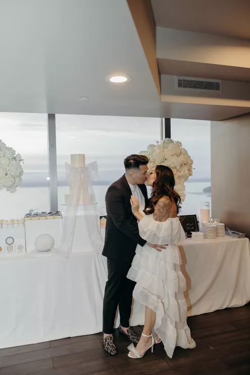The couple’s engagement party took place 75 floors above Seattle at the iconic Columbia Tower Club, a venue known for its panoramic views of the city skyline. Guests followed a chic all-black dress code, perfectly complementing the evening’s polished, couture-inspired aesthetic.