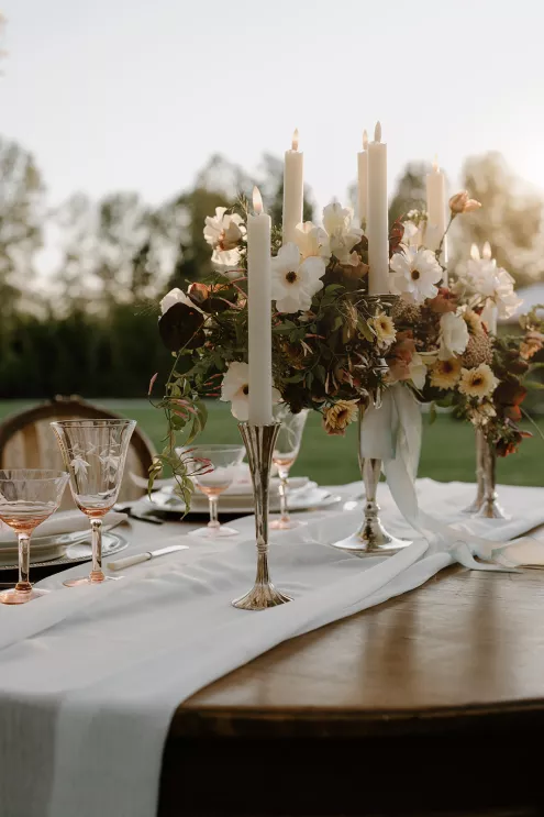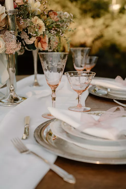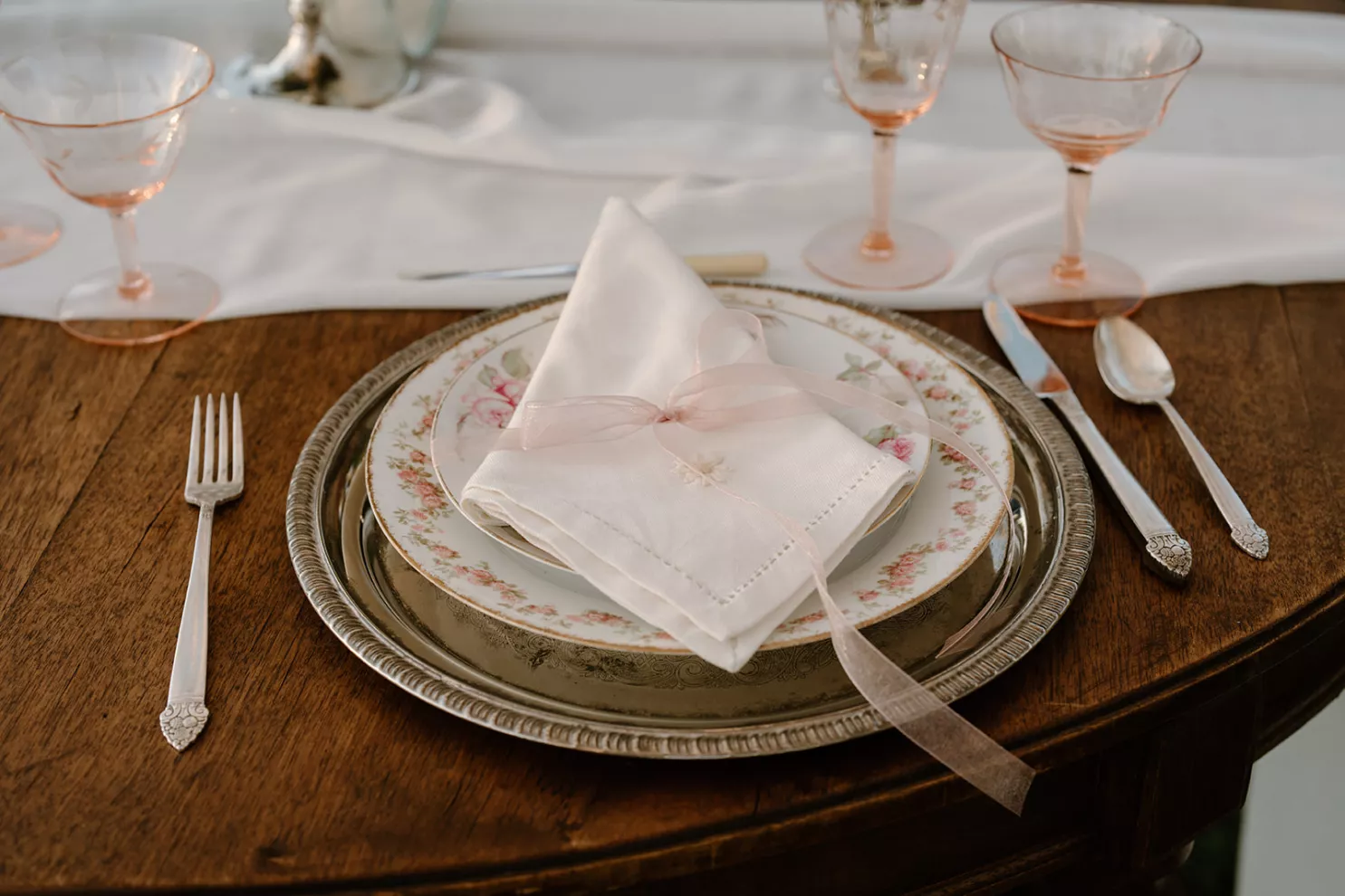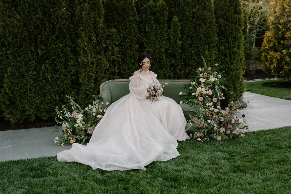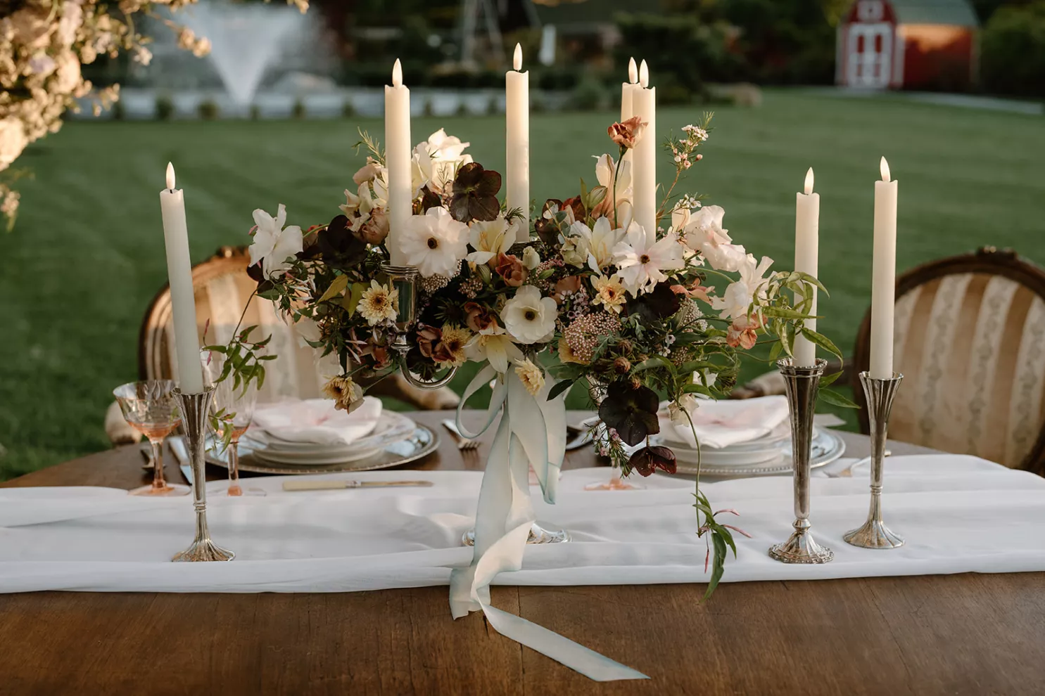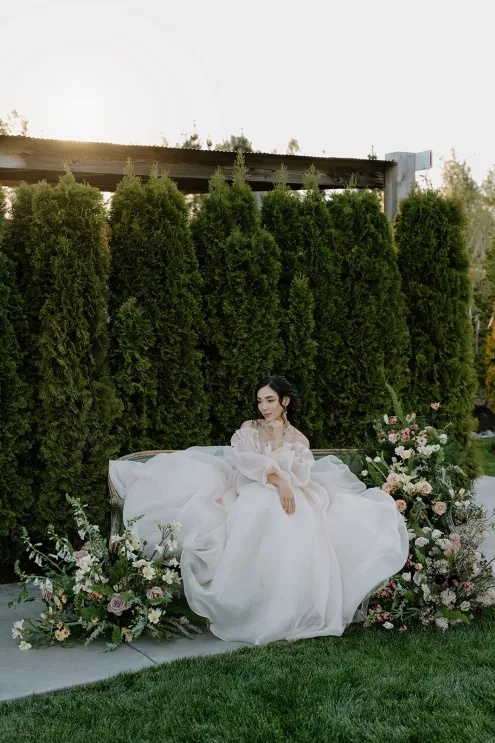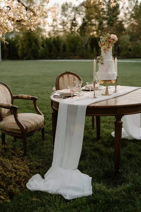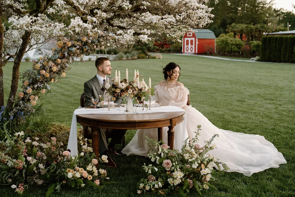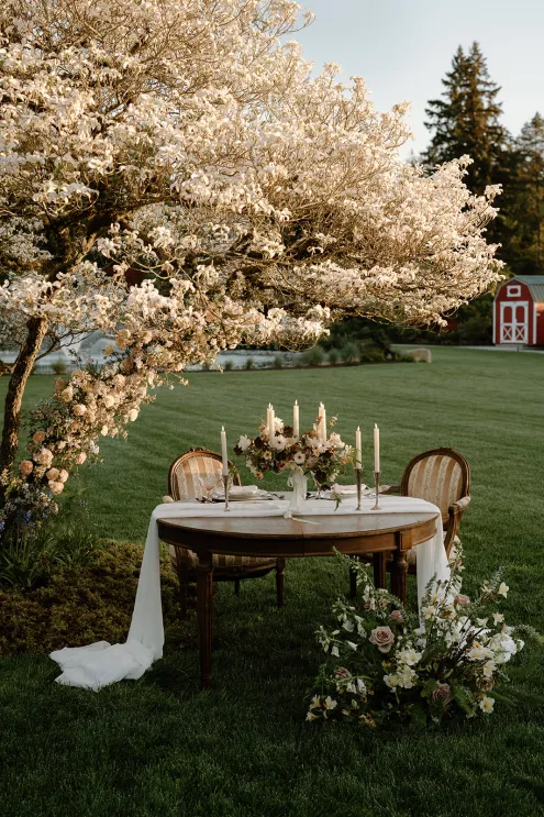 Immediately following the famous “golden hour”—the darling of photographers worldwide—comes an equally stunning time of day: twilight. Magic can happen as the sun dips below the horizon and a deeper color begins to pour over the landscape. Twilight at the Trillium Nursery Farm in Redmond set a breathtaking scene for this Old-World design accented with contemporary details. “Drawing from the lush surroundings of the gardens and meticulously landscaped surroundings, this design combines vintage elements that whimsically sync with modern touches,” says planner and designer Marcea Galindo of MG Event Design.