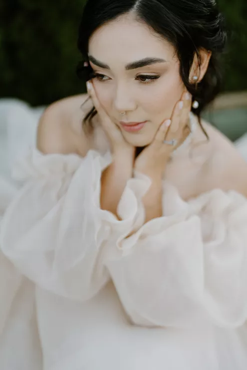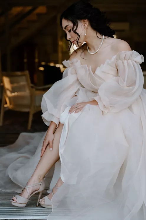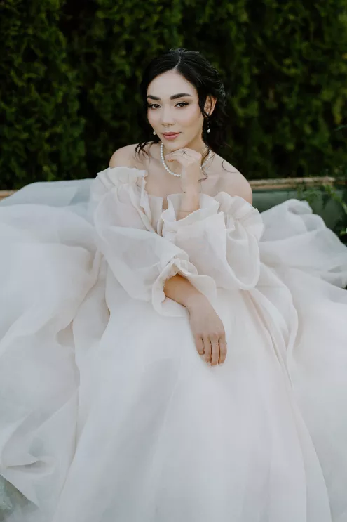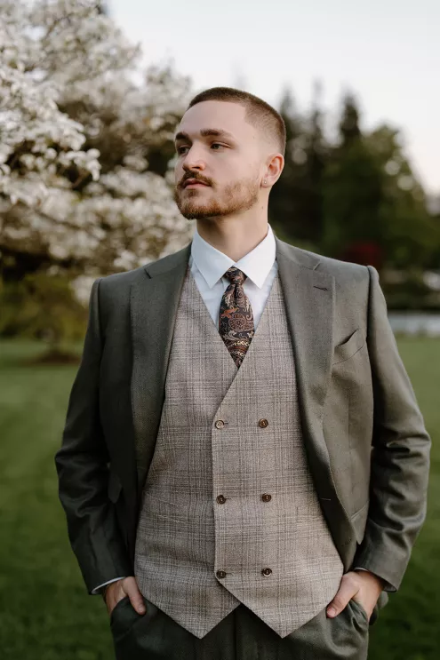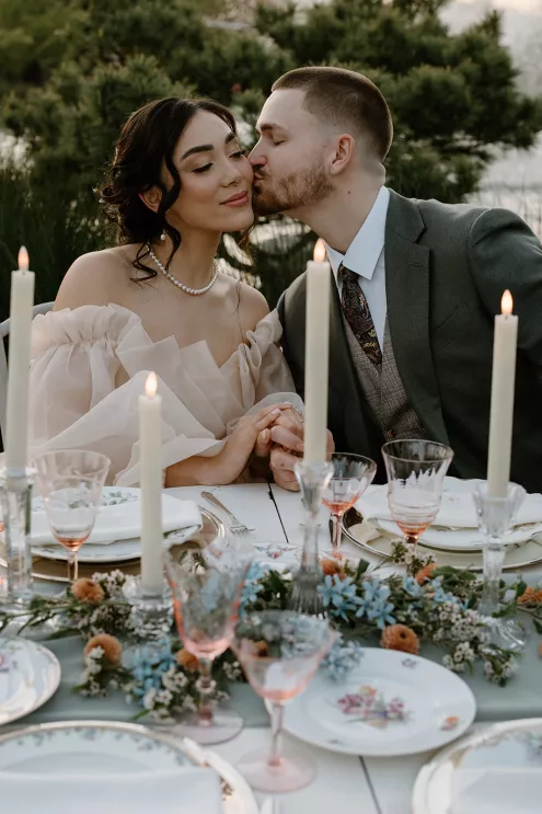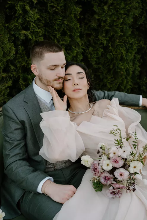 The bride’s billowing gown added an air of graceful playfulness. Flowing effortlessly, the dress was a perfect pairing with the groom’s custom-made suit, which was classically elegant with subtle modern touches. Together, their looks embodied the whimsical references to the past that inspired the day’s design.