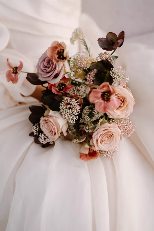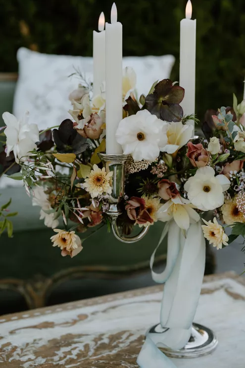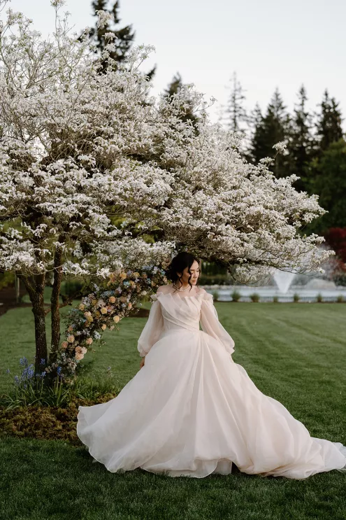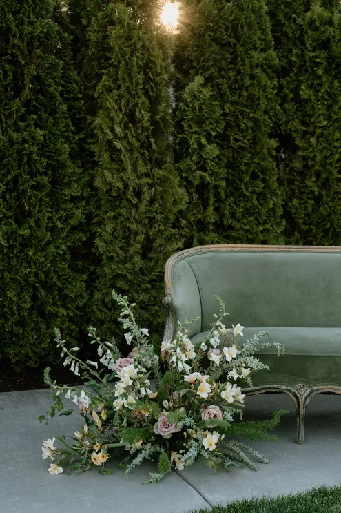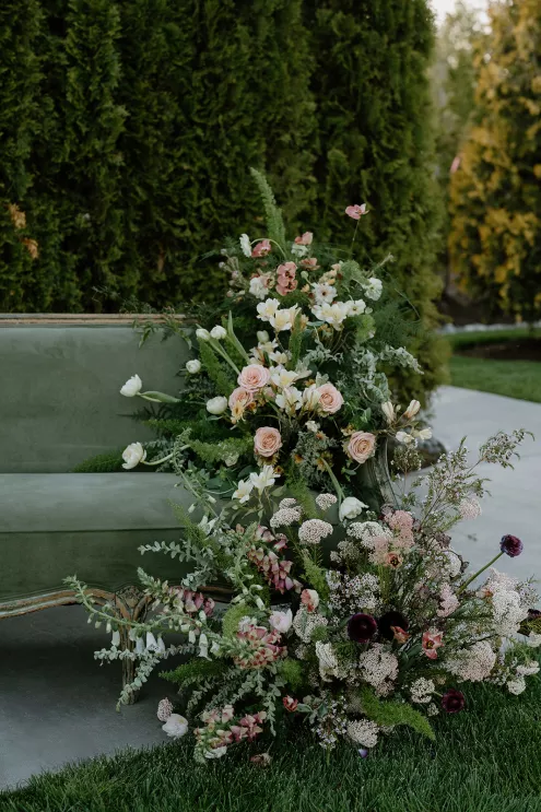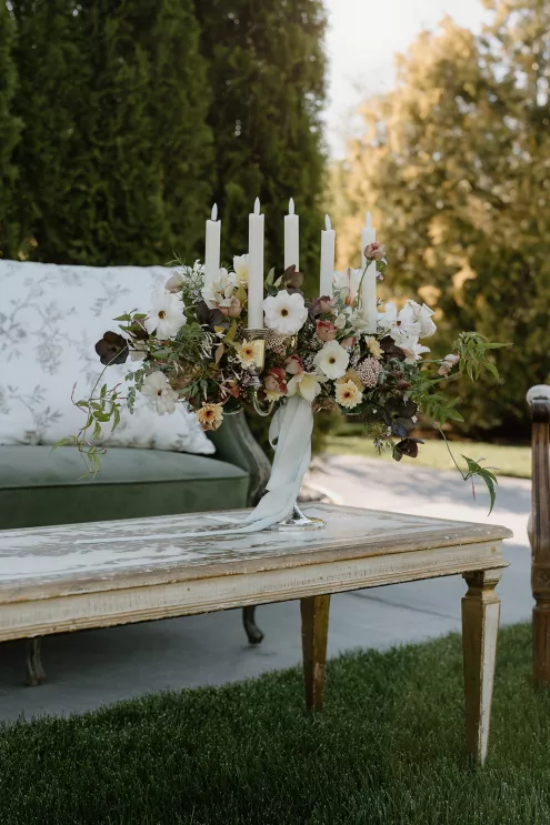 The chosen blossoms—butterfly ranunculus, astrantia, spirea and jasmine vine— expertly complemented the dreamy dogwood tree adorned with ivory blooms and some additional climbing florals. Details were thoughtfully incorporated to create a sense of nostalgia—antique furniture draped in wild, lush flowers softened the tableau and built an atmosphere of romance.