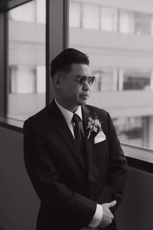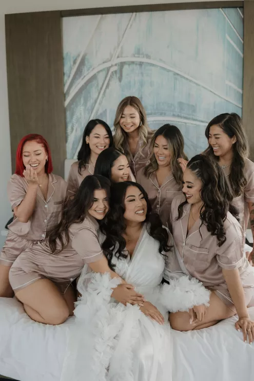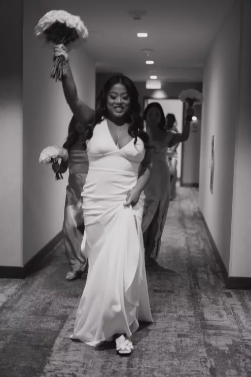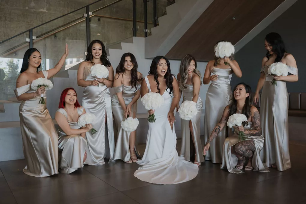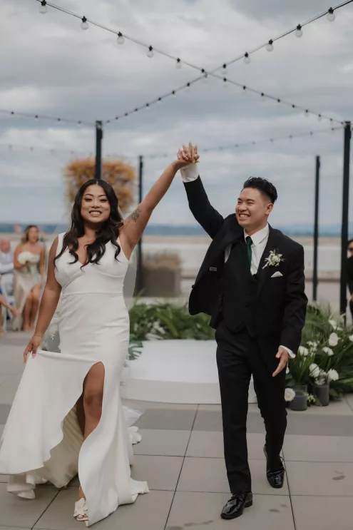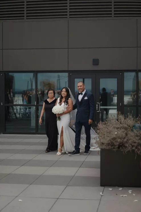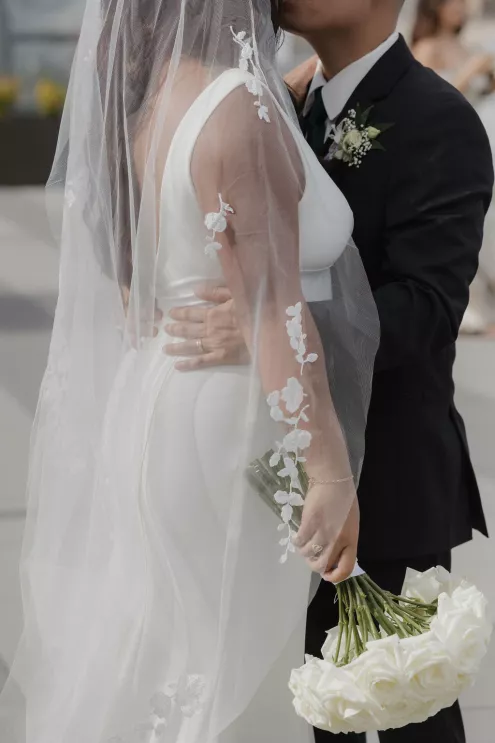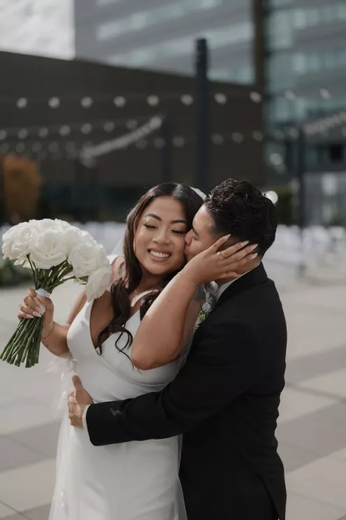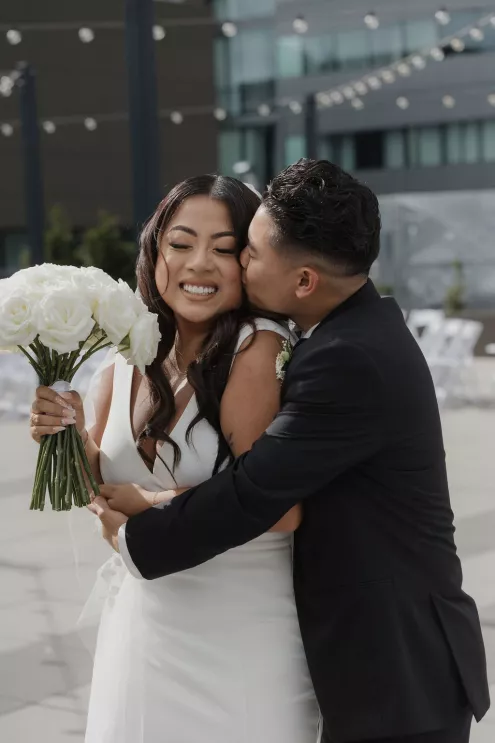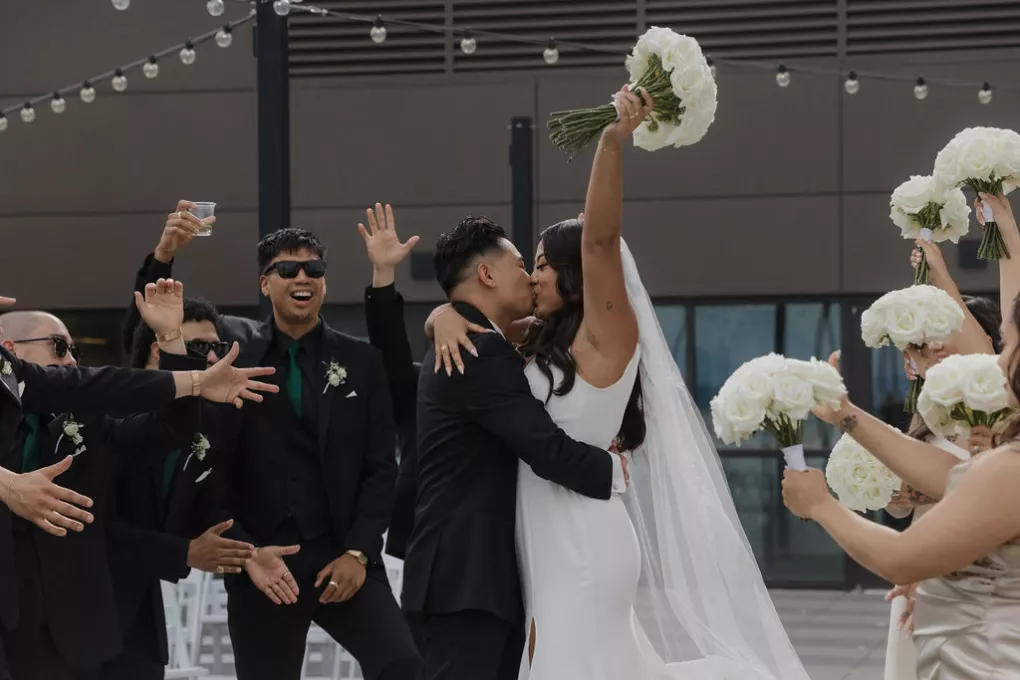 Eight years of adventures and unforgettable experiences built up to Teena Thach and Simon Legaspi’s eclectic wedding day. Simon first encountered Teena when he heard her singing at a Filipino-American Student Association event at Seattle University, but they didn’t actually speak until a year later, when Simon discovered Teena on Instagram and they began exchanging likes and comments on each other’s posts. These led to DMs, video calls and eventually their first date at The Cheesecake Factory. Within a month, the couple discovered a mutual passion for adventures and soon knew they were meant to be together. Simon hatched an elaborate plan to propose to Teena while traveling to Bali to celebrate her birthday. He schemed with friends, flight attendants and the pilot on their airplane to allow Simon to propose over the intercom. When the time came to plan their wedding, the couple embraced classic, black-and-white aesthetics. Tall, bright glass windows and round bouquets of pure white flowers created an elegant atmosphere. The couple took care to personalize their day with fun details, including boba tea. The celebration unfolded on the sunny outdoor terrace while the reception dinner took place in a candlelit ballroom. The night concluded with dancing and joyous music as the couple entered a bright new chapter of their lives