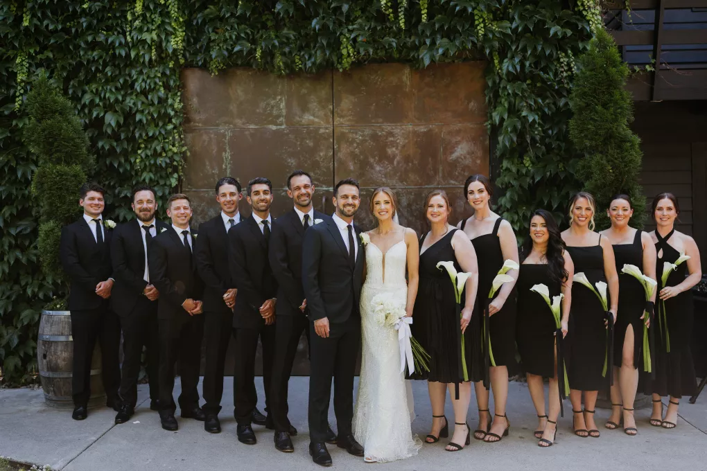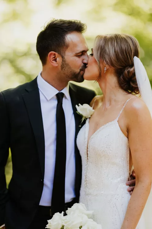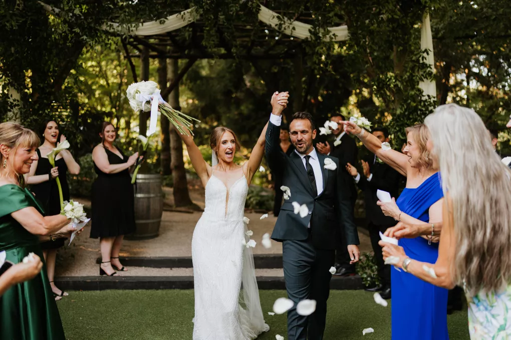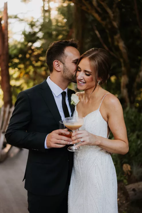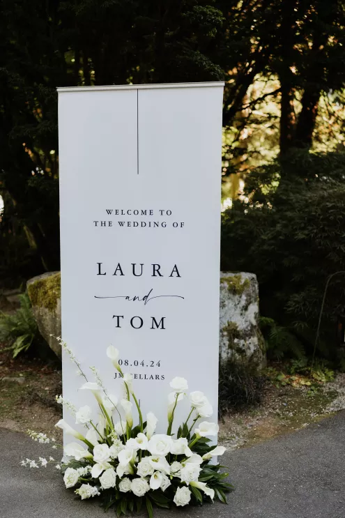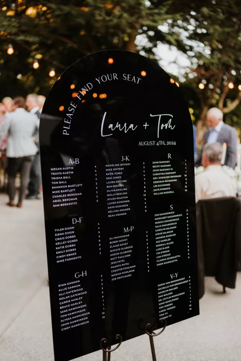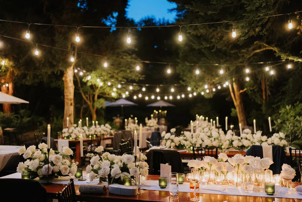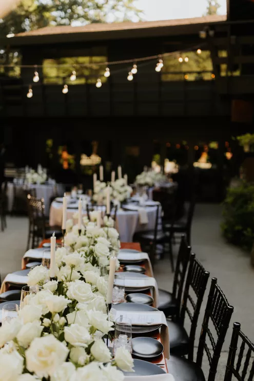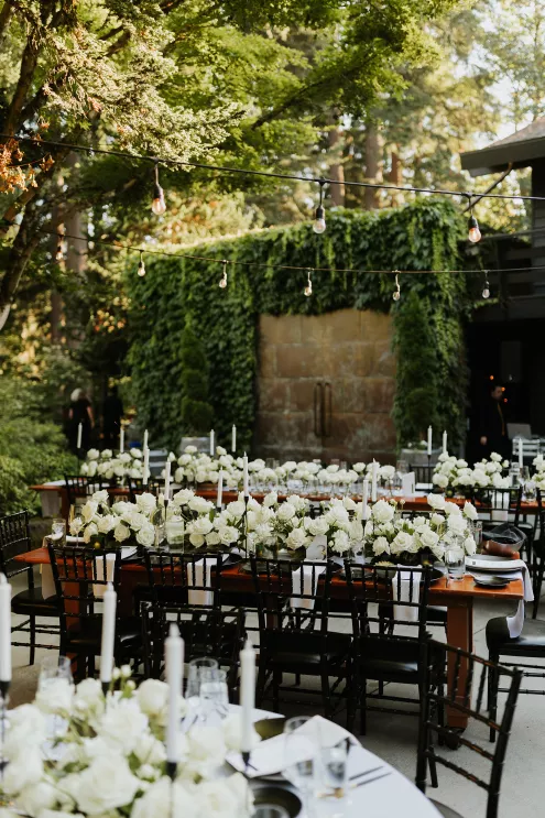 Ensconced by leafy green trees and the enchanting JM Cellars winery, Laura Hawkinson and Tom Radvany became husband and wife. The couple wanted a stress-free and timeless celebration that matched their personalities and honored their families. The design focused on minimalism, with black and white décor that allowed the venue’s natural beauty to shine. Soft yellow sunlight filtered through the tree canopy, dappling the vines, floral arrangements and wooden trellis while the couple exchanged vows. The outdoor reception dinner included rows of creamy white flowers at every table beneath romantic fairy lights. As night fell, the enchanting feeling grew stronger, with soft candlelight adding depth to the scene. In honor of Tom’s Philadelphia roots, mini-Philly cheesesteak sliders, complete with tiny Eagles flags, were brought out as late-night snacks.