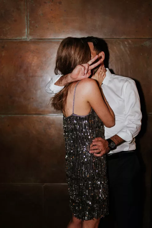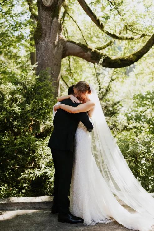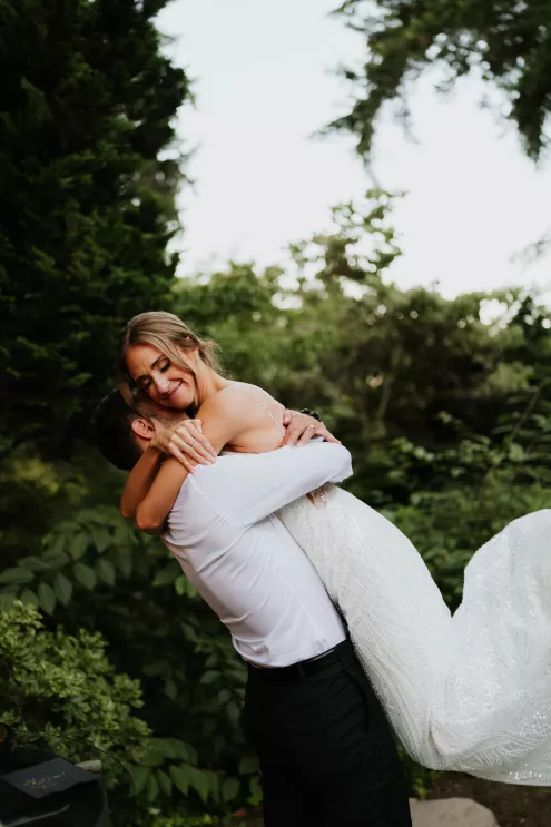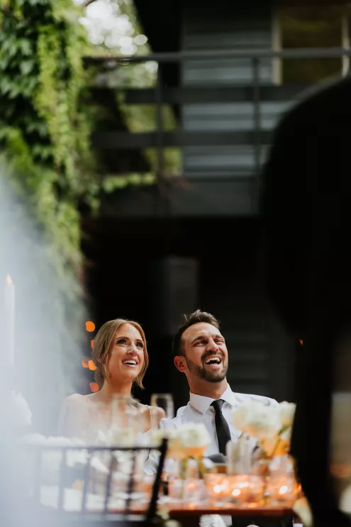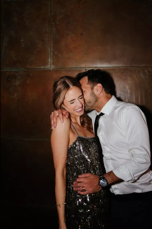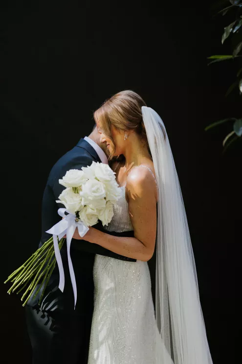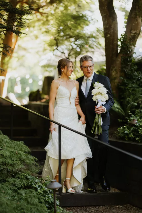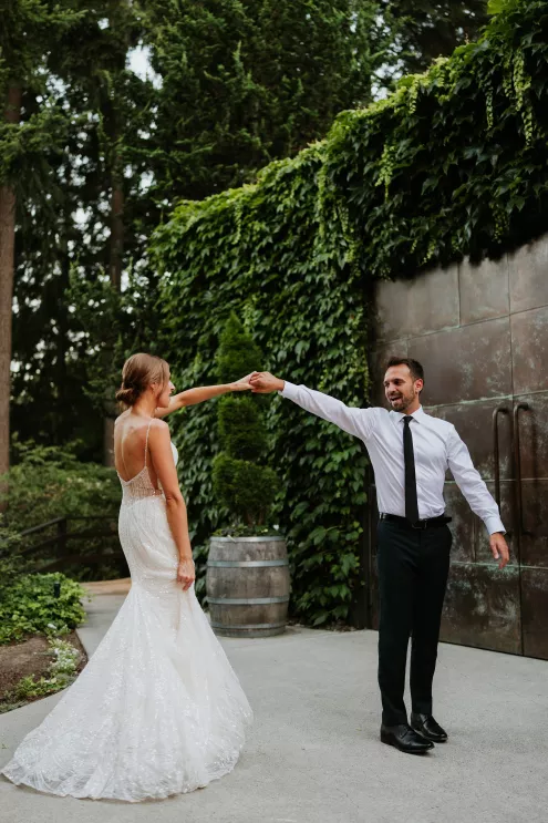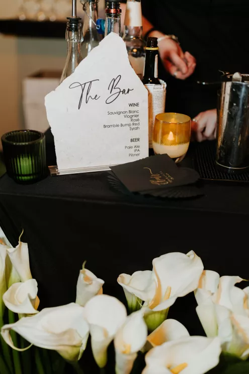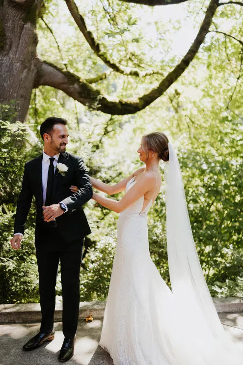 Ensconced by leafy green trees and the enchanting JM Cellars winery, Laura Hawkinson and Tom Radvany became husband and wife. The couple wanted a stress-free and timeless celebration that matched their personalities and honored their families. The design focused on minimalism, with black and white décor that allowed the venue’s natural beauty to shine. Soft yellow sunlight filtered through the tree canopy, dappling the vines, floral arrangements and wooden trellis while the couple exchanged vows. The outdoor reception dinner included rows of creamy white flowers at every table beneath romantic fairy lights. As night fell, the enchanting feeling grew stronger, with soft candlelight adding depth to the scene. In honor of Tom’s Philadelphia roots, mini-Philly cheesesteak sliders, complete with tiny Eagles flags, were brought out as late-night snacks.