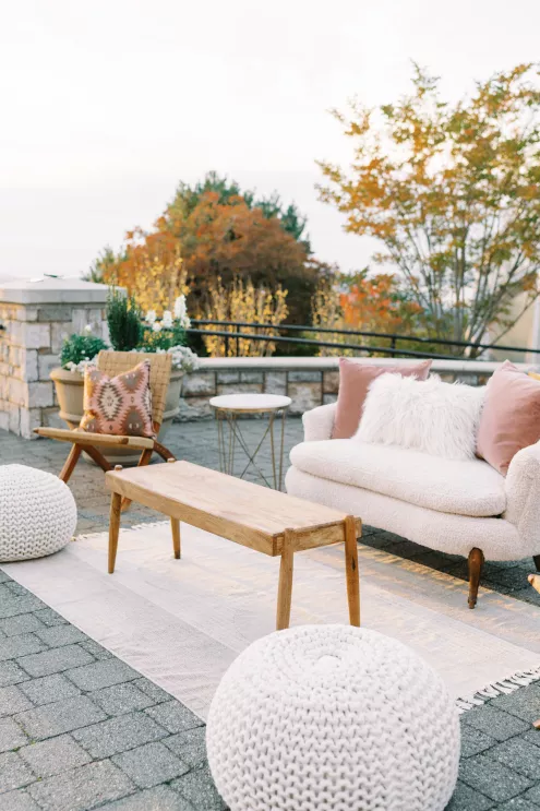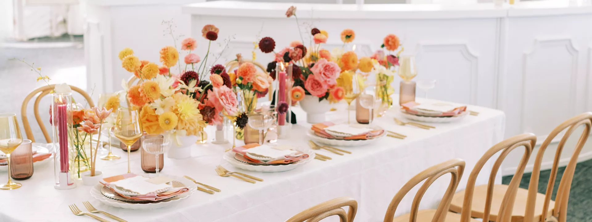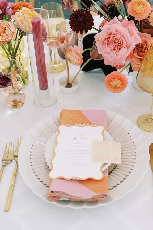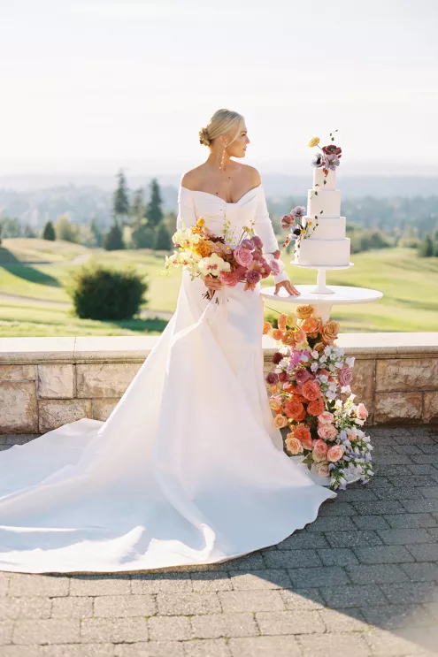 Set against the classic elegance of The Golf Club at Newcastle, the vibrant scheme made a striking statement within the neutral space, harmonizing with sweeping views of the pristine grounds and the natural beauty of the Pacific Northwest. The team collaborated with Florals by Maria to decorate the venue with luxurious blooms in a joyful palette ranging from shades of purples and pinks to oranges and yellows. The rainbow of colors remained expertly polished and exuded opulence.