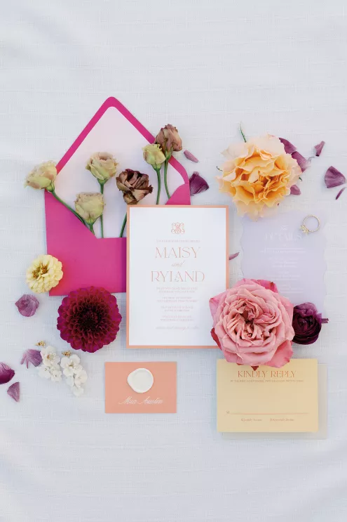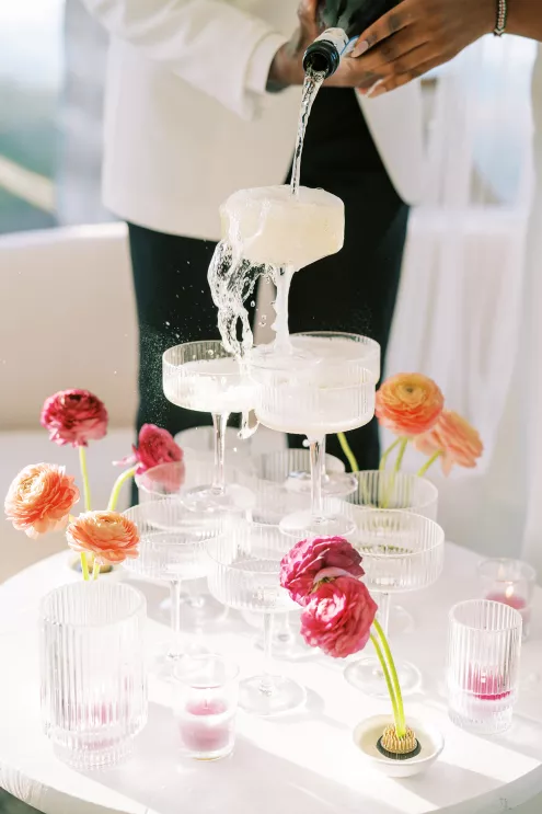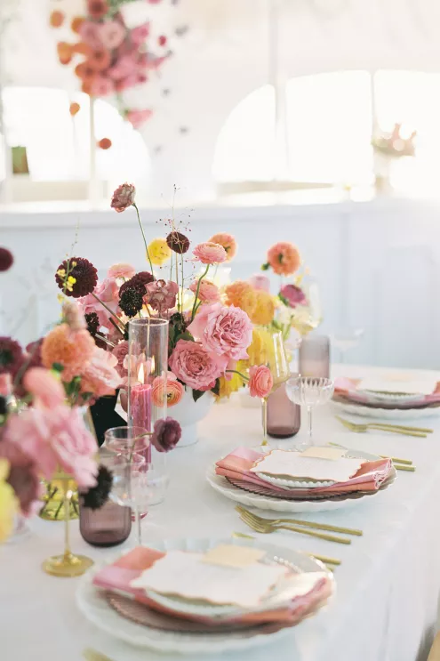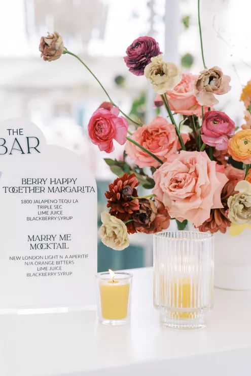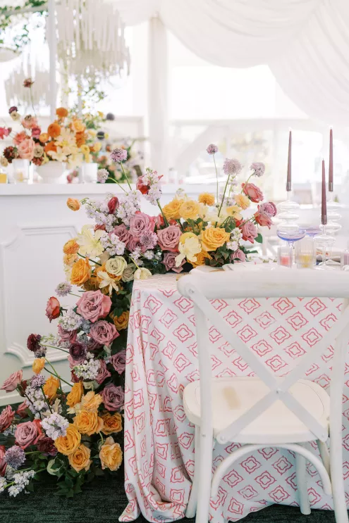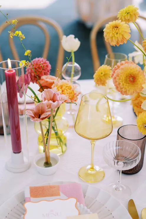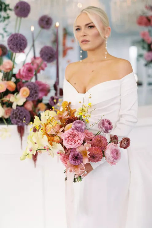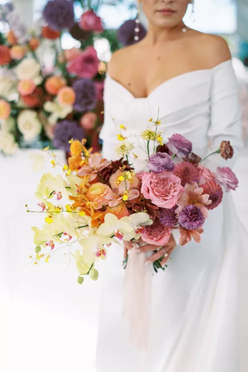 Leaning into the cheerful theme, the sleek bar was garnished with bundles of roses in vivid pigments and thriving greenery. Overhead, chandeliers offered a soft glow, casting a spotlight onto the enchanting scene of splendor. A grand four-tiered cake demanded attention, acting as a punchy focal point adorned with lavender, mauve and yellow flowers while zesty florals crawled up the stem of the tulip-style tableau. From ceremony to Champagne tower, this concept proves that a wedding can embrace maximalist flair while staying true to a clean minimalist-chic aesthetic.