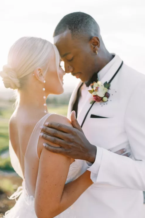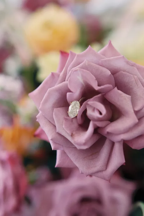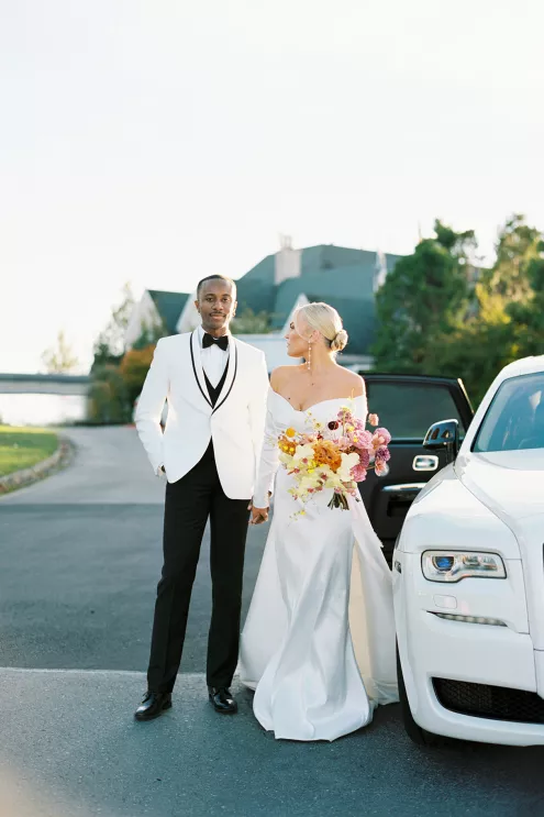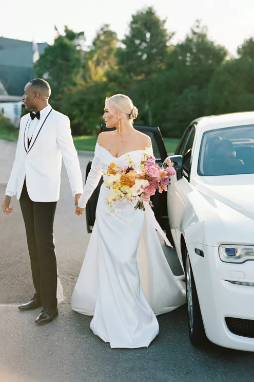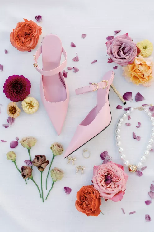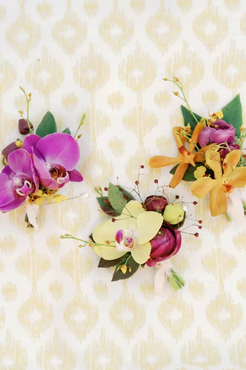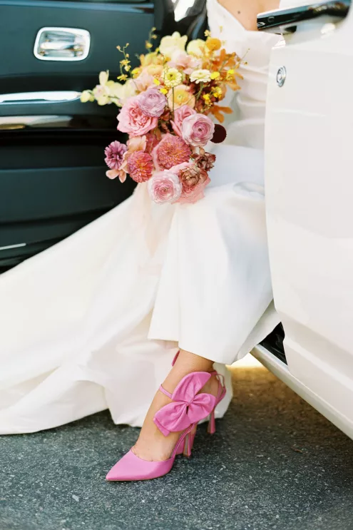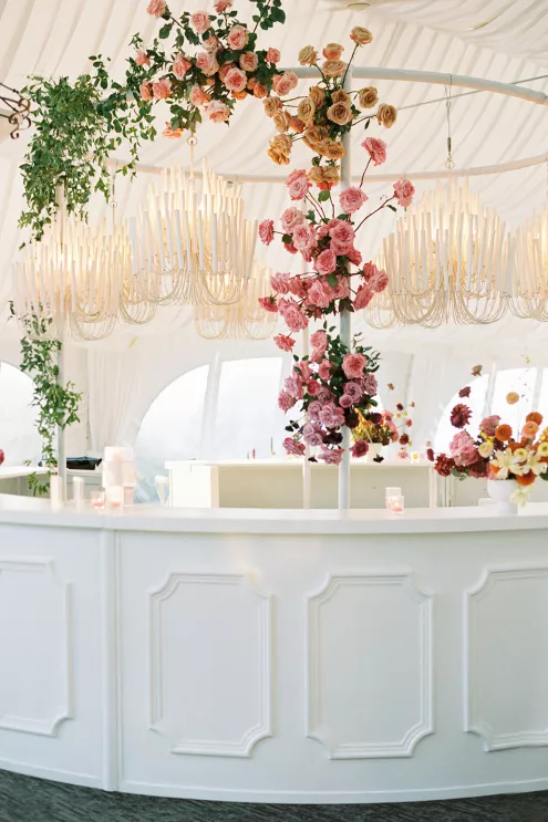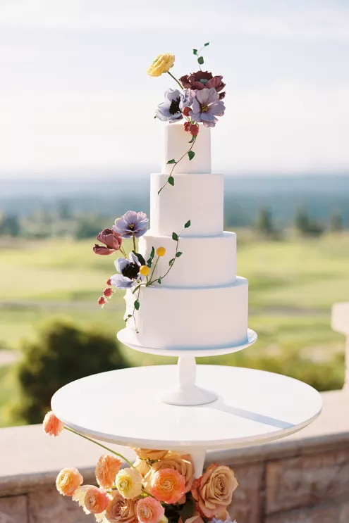 Leaning into the cheerful theme, the sleek bar was garnished with bundles of roses in vivid pigments and thriving greenery. Overhead, chandeliers offered a soft glow, casting a spotlight onto the enchanting scene of splendor. A grand four-tiered cake demanded attention, acting as a punchy focal point adorned with lavender, mauve and yellow flowers while zesty florals crawled up the stem of the tulip-style tableau. From ceremony to Champagne tower, this concept proves that a wedding can embrace maximalist flair while staying true to a clean minimalist-chic aesthetic.