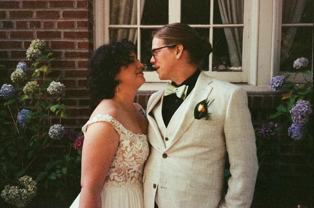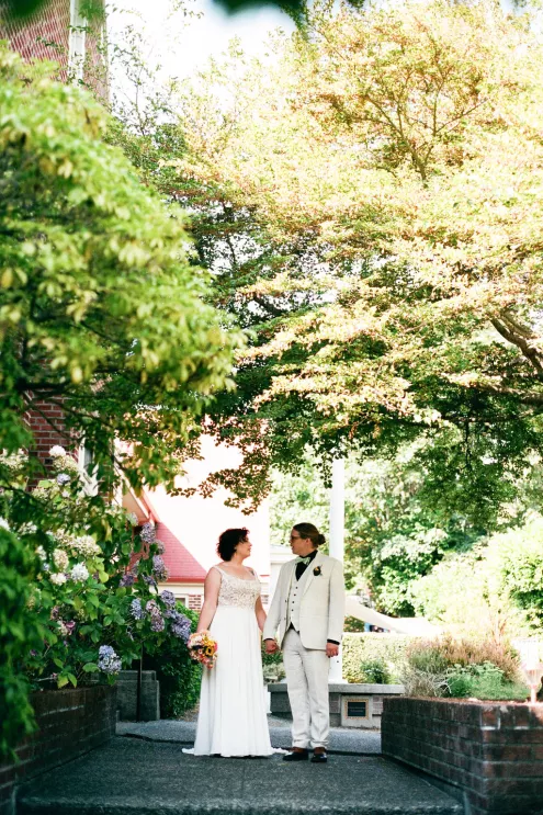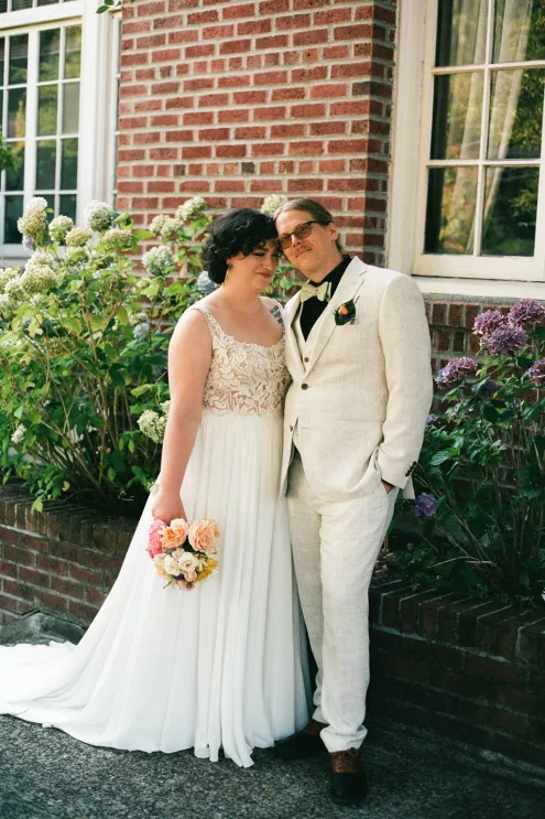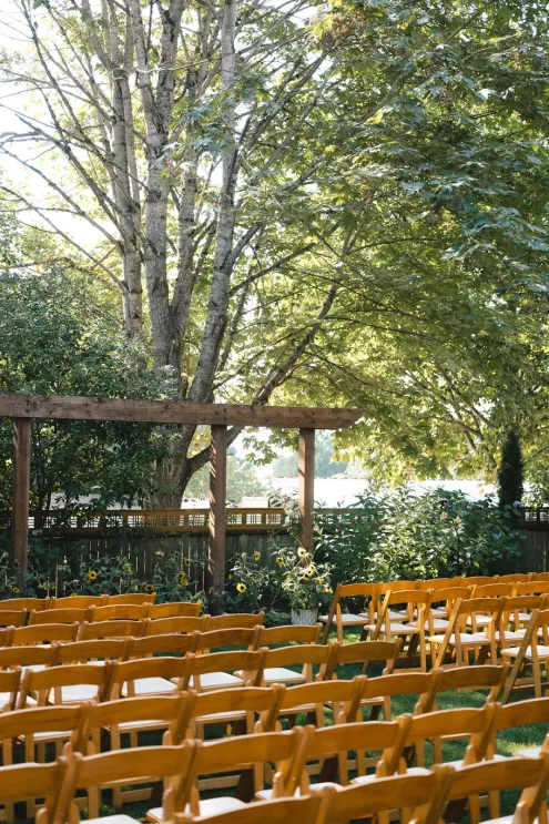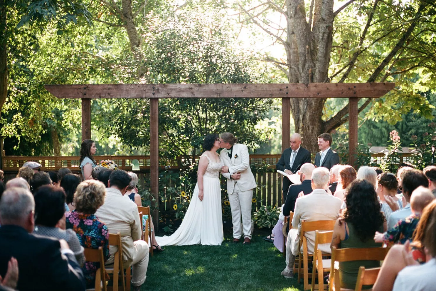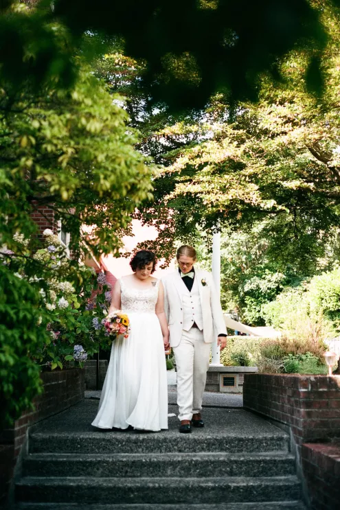 Sarah and Matt chose to celebrate where their life already felt full — in the neighborhoods they call home. On a Friday afternoon in West Seattle, guests found their seats in the garden at the Hall at Fauntleroy as the couple walked in together, following both sets of parents. The bride carried flowers clipped straight from her mother’s garden, and the ceremony arch bloomed with sunflowers arranged by family hands. Their officiant — a close friend from Matt’s years playing in a punk band — read vows the couple had crafted collaboratively, keeping true to the way they build things in real life: side by side.