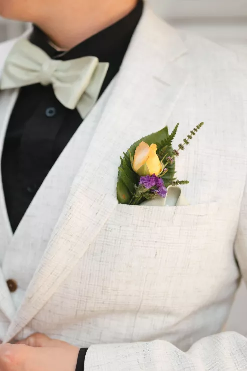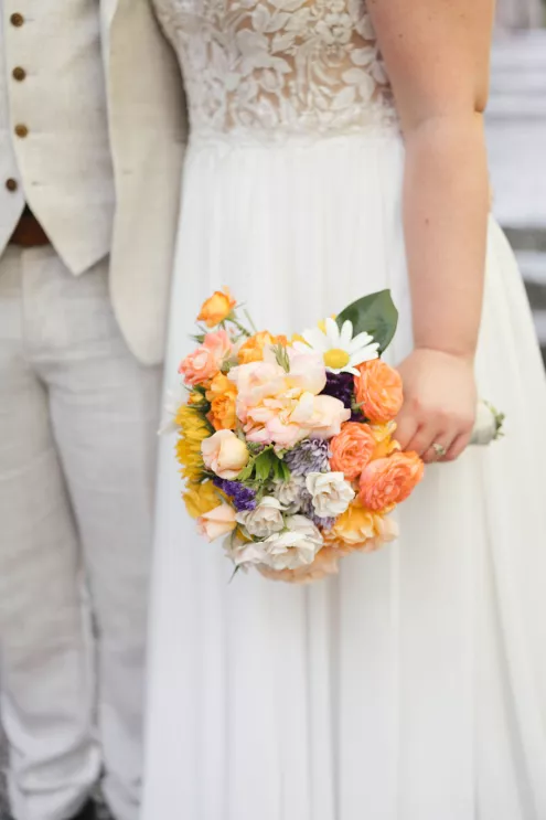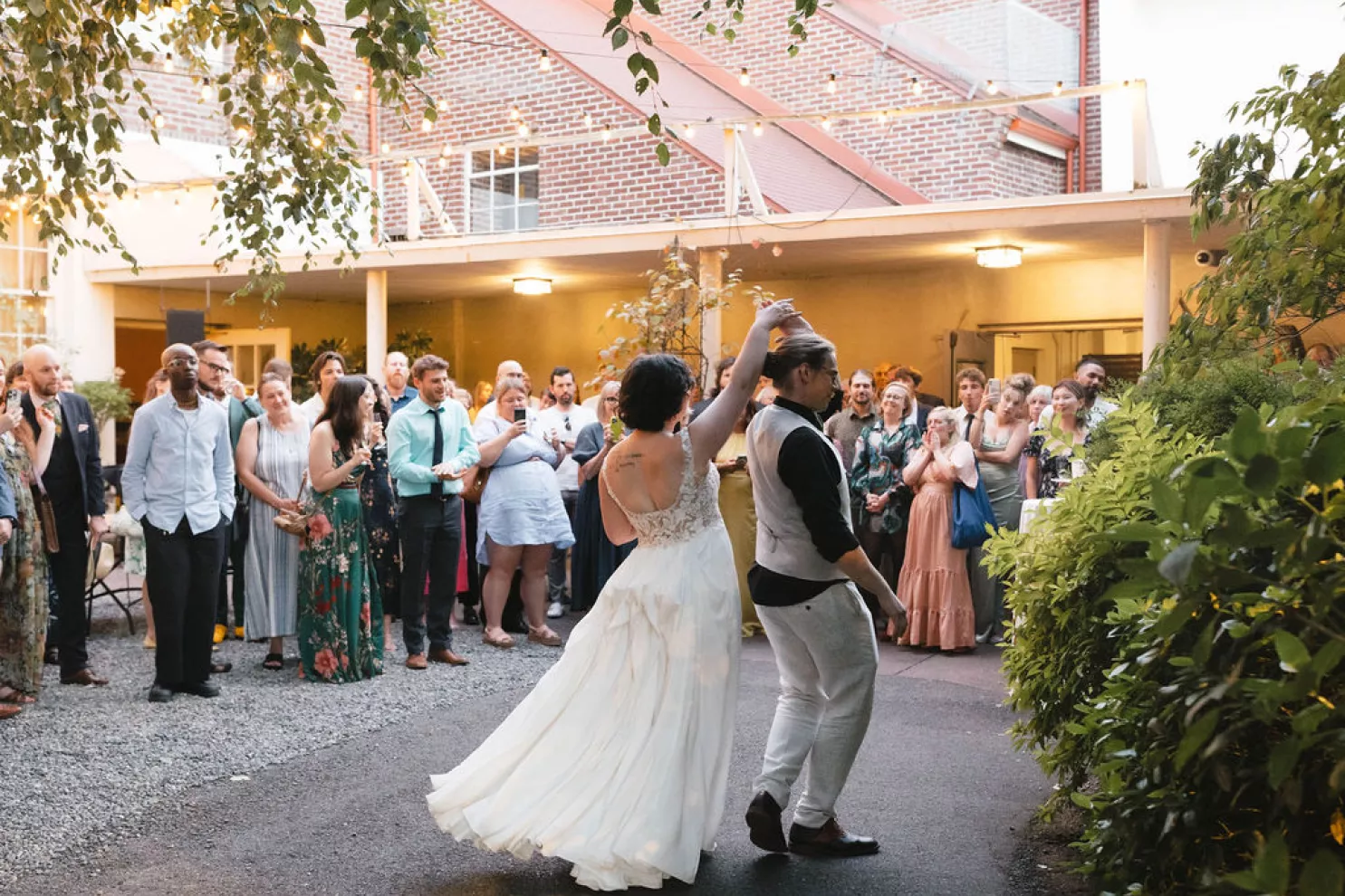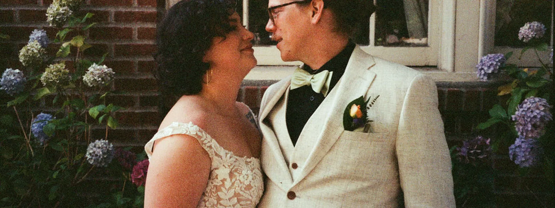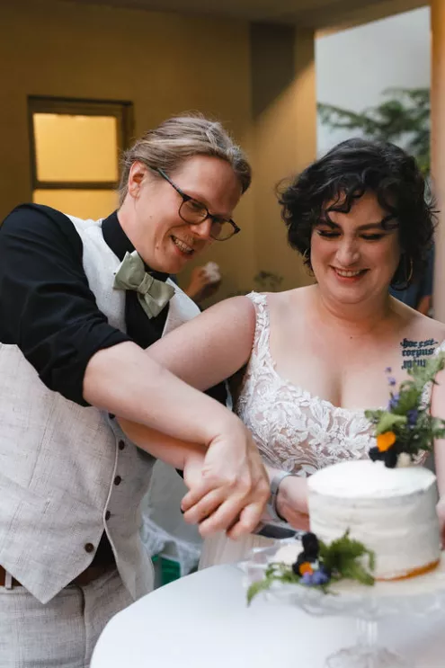 Sarah and Matt chose to celebrate where their life already felt full — in the neighborhoods they call home. On a Friday afternoon in West Seattle, guests found their seats in the garden at the Hall at Fauntleroy as the couple walked in together, following both sets of parents. The bride carried flowers clipped straight from her mother’s garden, and the ceremony arch bloomed with sunflowers arranged by family hands. Their officiant — a close friend from Matt’s years playing in a punk band — read vows the couple had crafted collaboratively, keeping true to the way they build things in real life: side by side.