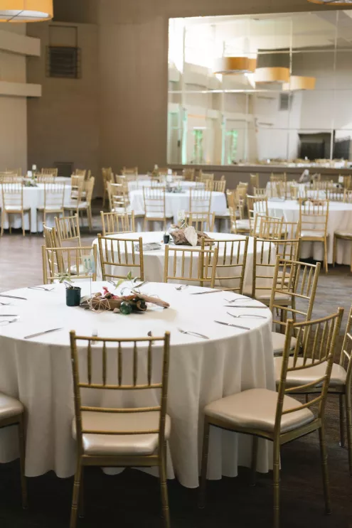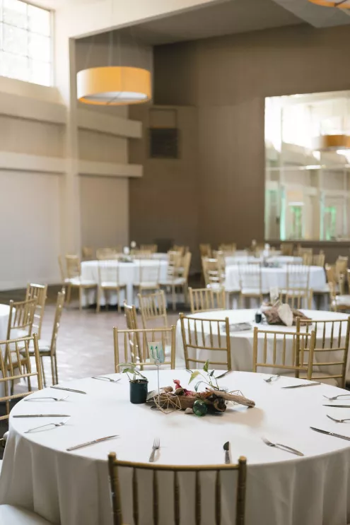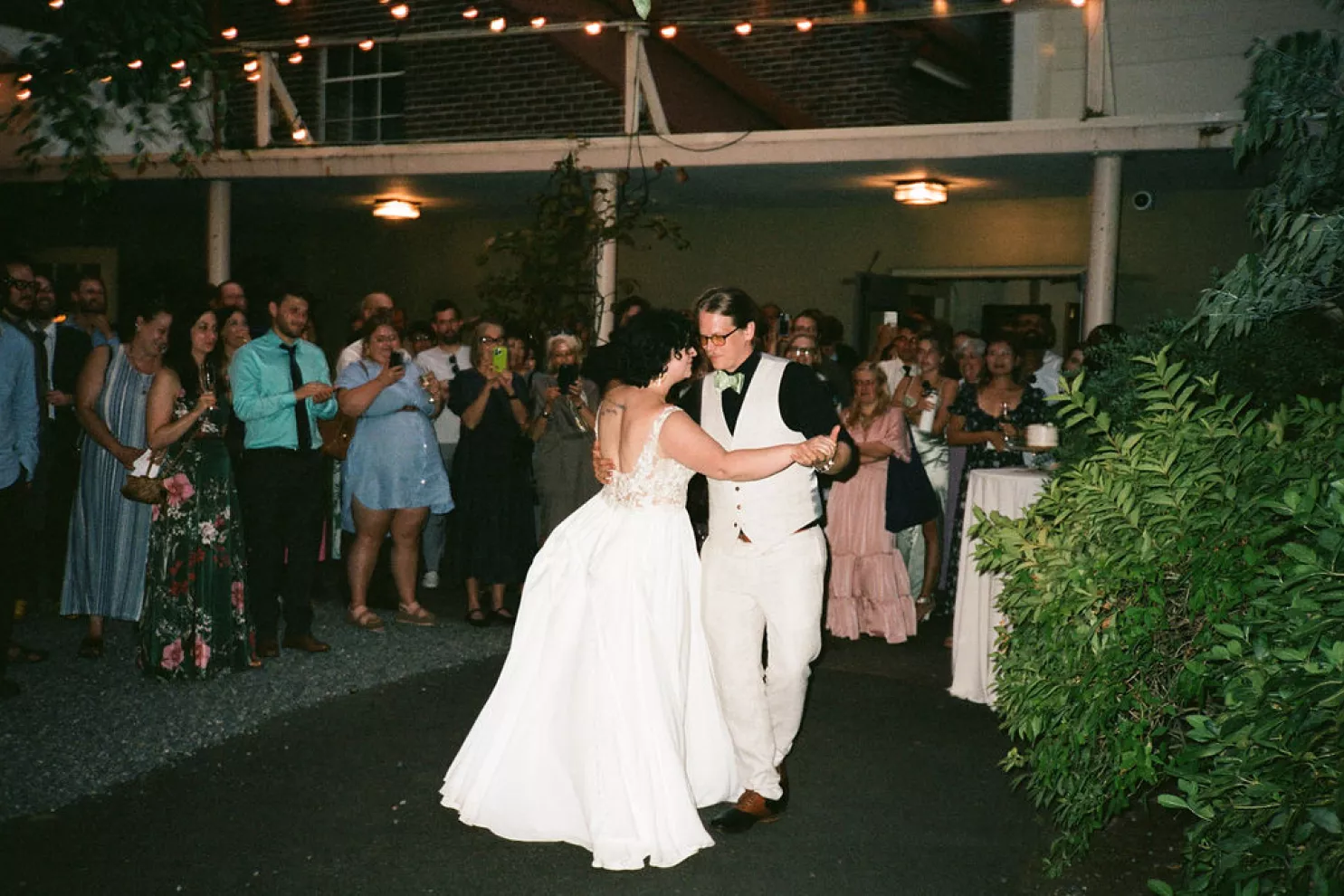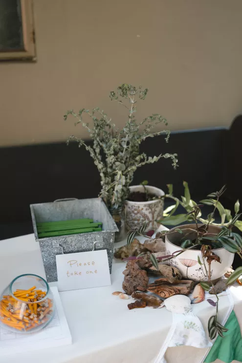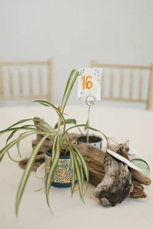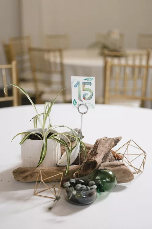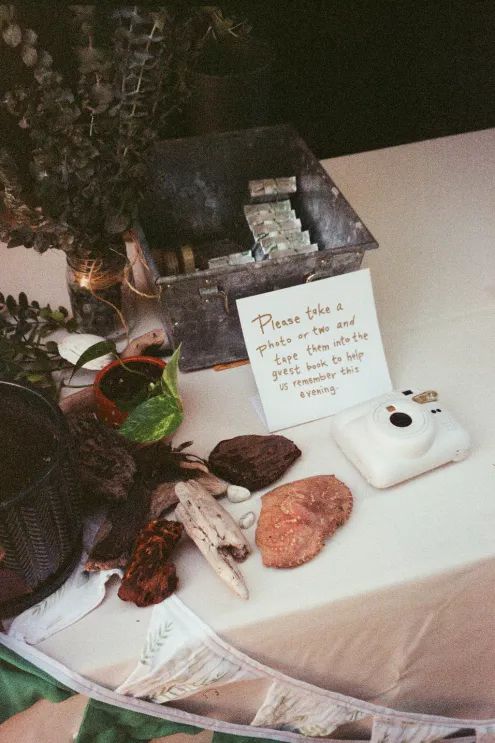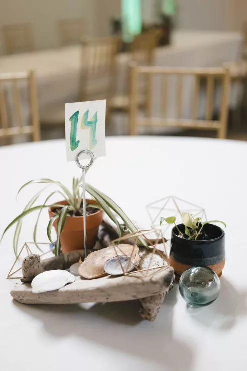Inside the reception room, tables held driftwood and oyster shells collected over months, houseplants grown by friends and tiny toothpick platonic solids — a wink to the couple’s shared math background. Carpenter’s pencils engraved with their names sat at each place setting, clever and unfussy, the kind of favor that actually ends up in a junk drawer and gets used. When the DJ dropped “Message to Rudy” for the first dance, the night kicked up. Shoes came off, and a mosh-pit-meets-wedding-dance floor formed without hesitation.