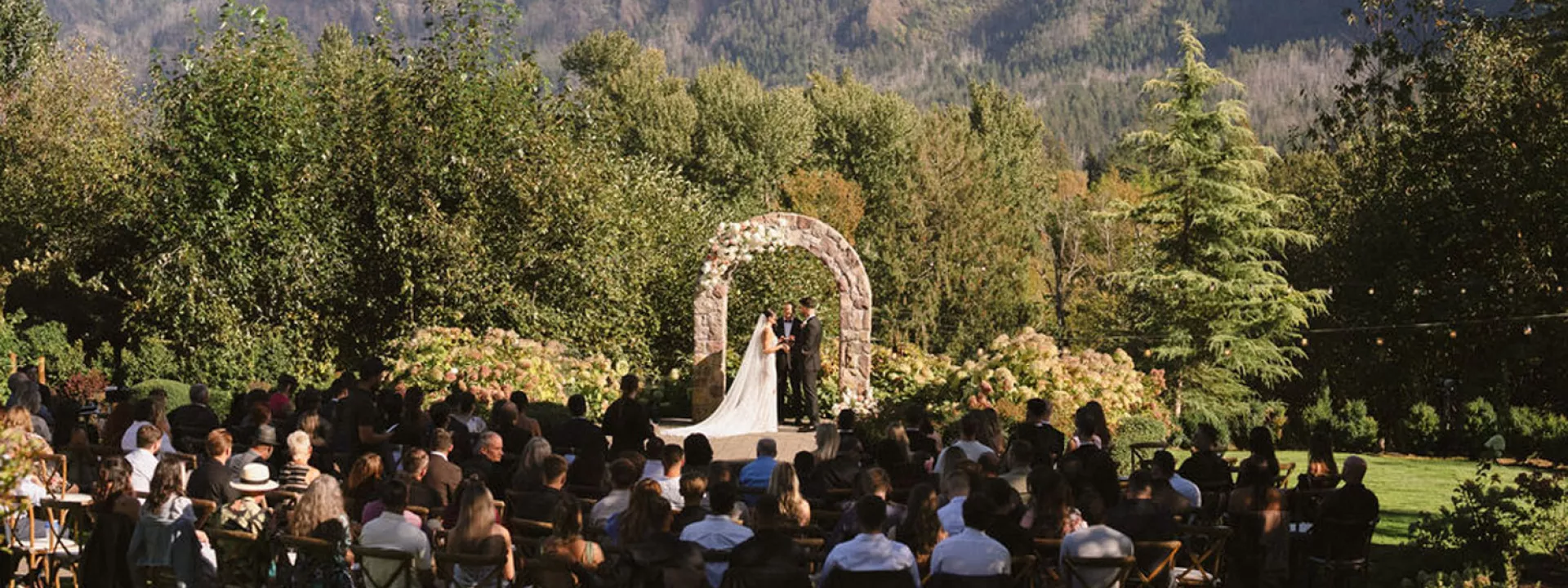 "Love" was how Analise and Philipp's love story began, as both of them took up tennis to pass the time during the COVID-19 pandemic. Analise, impressed with Philipp's confidence on and off the court, agreed to a picnic date where the two quickly realized that they were truly meant to be. Nestled between the Columbia River Gorge and the Cascade Mountains, the bride and groom invited their family and friends to celebrate the start of their next chapter. Leaning into the natural beauty of Stevenson, Washington, the wedding was a romantic garden party. Linens and décor were kept neutral, and florals offered a warm pop of color throughout the venue. The couple said "I do" beneath a stone archway in front of the mountains, glowing in the sunset, with rosy blooms and fluffy cream hydrangeas climbing up and surrounding them. The ceremony was emotional, with several nods to the couple's family and traditions; seats were reserved with photos of the bride and groom's fathers in memory. As the night went on, golden candlelight washed over the party as loved ones gathered to continue the festivities. The couple made sure to honor those not with them throughout the evening; there was a cigar bar dedicated to Analise's father, and Philipp's brother performed a Russian song written by their father. Music was one of the ways the couple honored their heritage throughout the night, with every song thoughtfully chosen for its significance. At the end of the night, guests were treated to one last tradition: boubounieres, a gift of sugared almonds symbolizing happiness, prosperity and the bittersweetness of life.