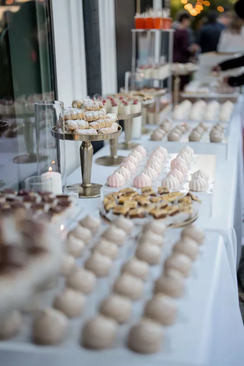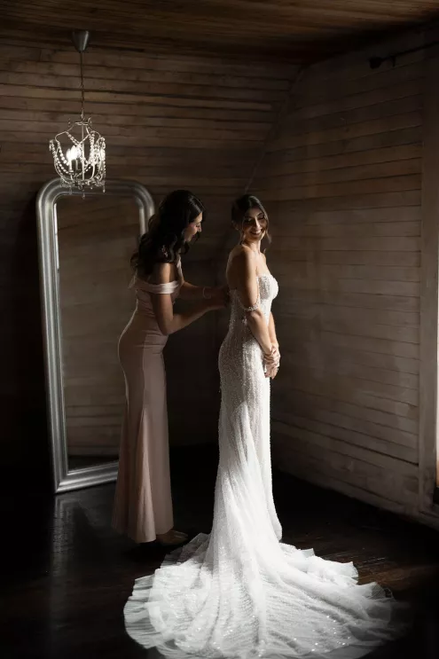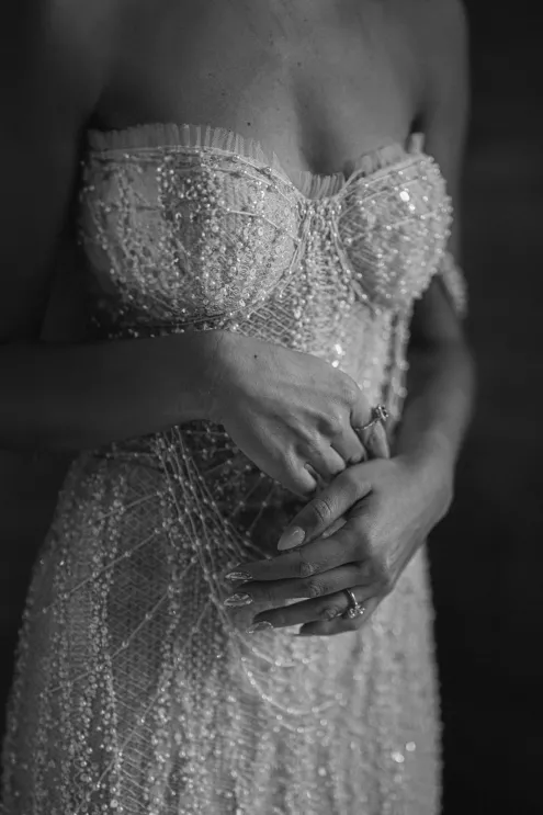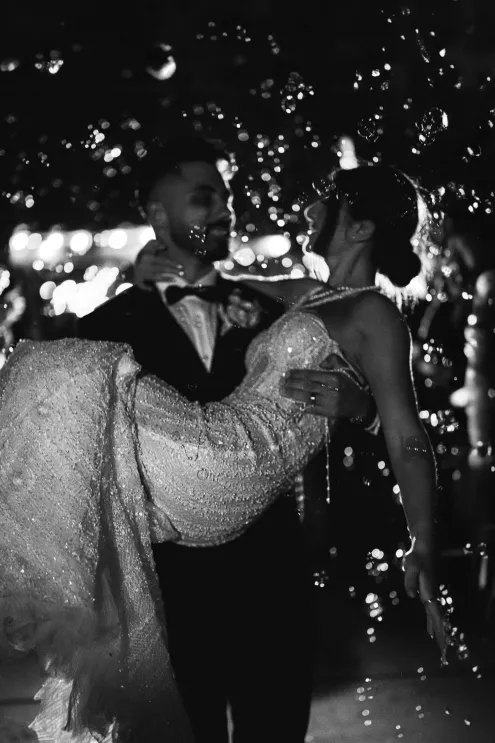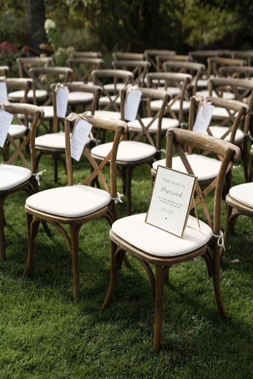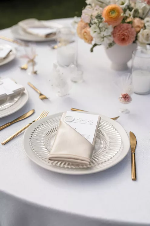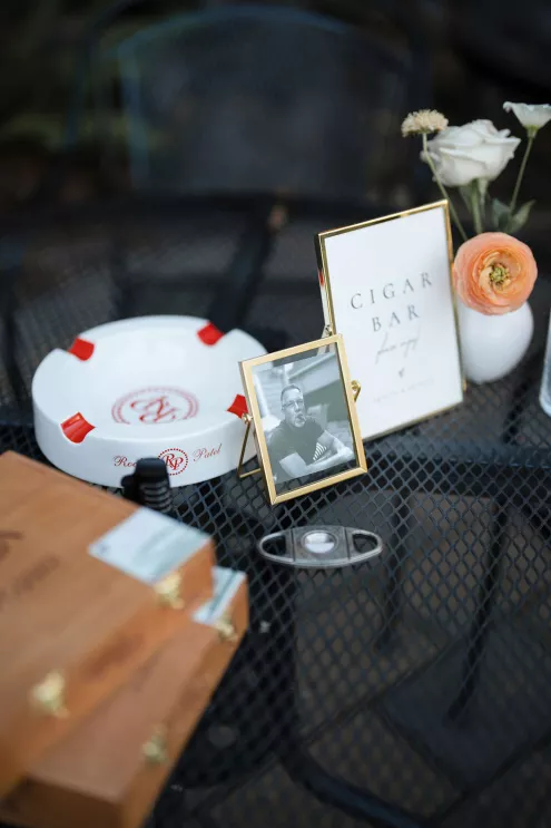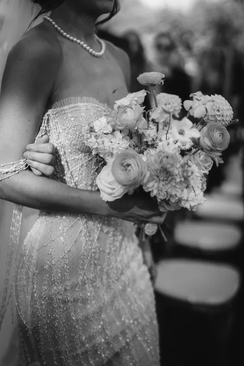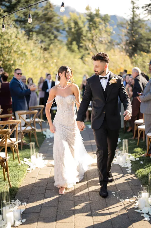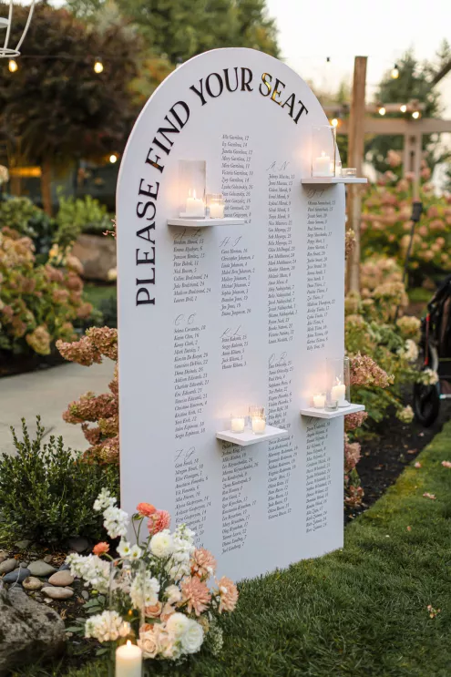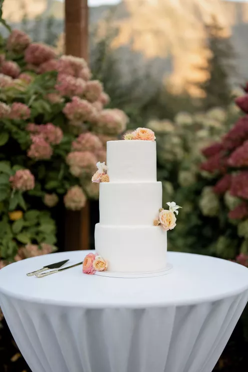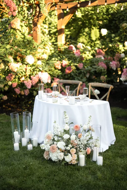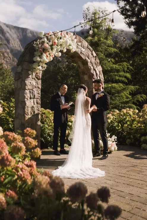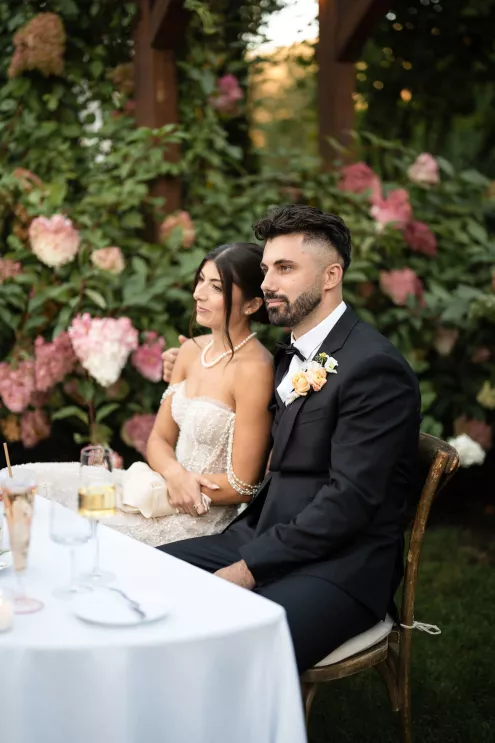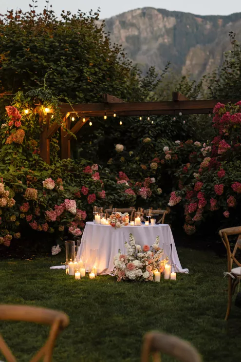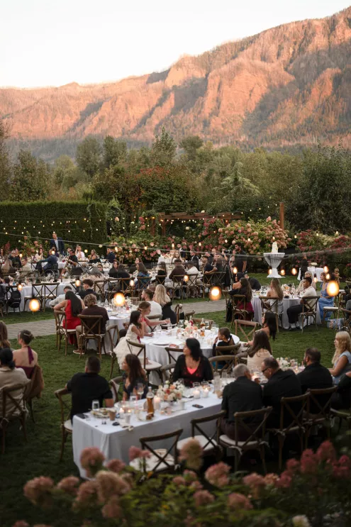 "Love" was how Analise and Philipp's love story began, as both of them took up tennis to pass the time during the COVID-19 pandemic. Analise, impressed with Philipp's confidence on and off the court, agreed to a picnic date where the two quickly realized that they were truly meant to be. Nestled between the Columbia River Gorge and the Cascade Mountains, the bride and groom invited their family and friends to celebrate the start of their next chapter. Leaning into the natural beauty of Stevenson, Washington, the wedding was a romantic garden party. Linens and décor were kept neutral, and florals offered a warm pop of color throughout the venue. The couple said "I do" beneath a stone archway in front of the mountains, glowing in the sunset, with rosy blooms and fluffy cream hydrangeas climbing up and surrounding them. The ceremony was emotional, with several nods to the couple's family and traditions; seats were reserved with photos of the bride and groom's fathers in memory. As the night went on, golden candlelight washed over the party as loved ones gathered to continue the festivities. The couple made sure to honor those not with them throughout the evening; there was a cigar bar dedicated to Analise's father, and Philipp's brother performed a Russian song written by their father. Music was one of the ways the couple honored their heritage throughout the night, with every song thoughtfully chosen for its significance. At the end of the night, guests were treated to one last tradition: boubounieres, a gift of sugared almonds symbolizing happiness, prosperity and the bittersweetness of life.