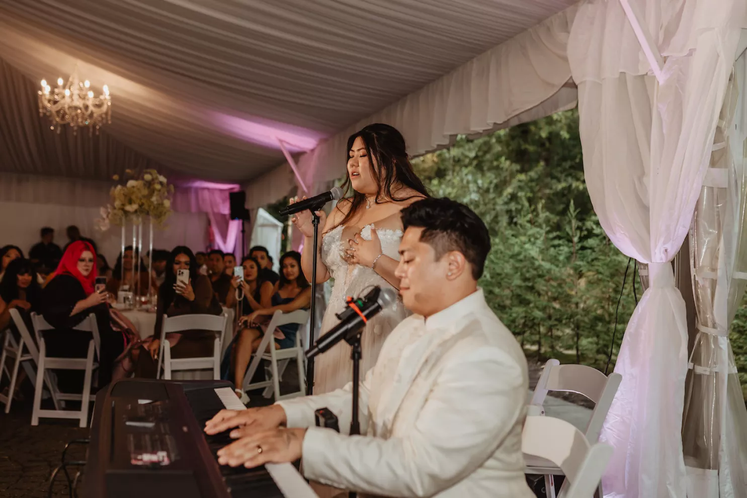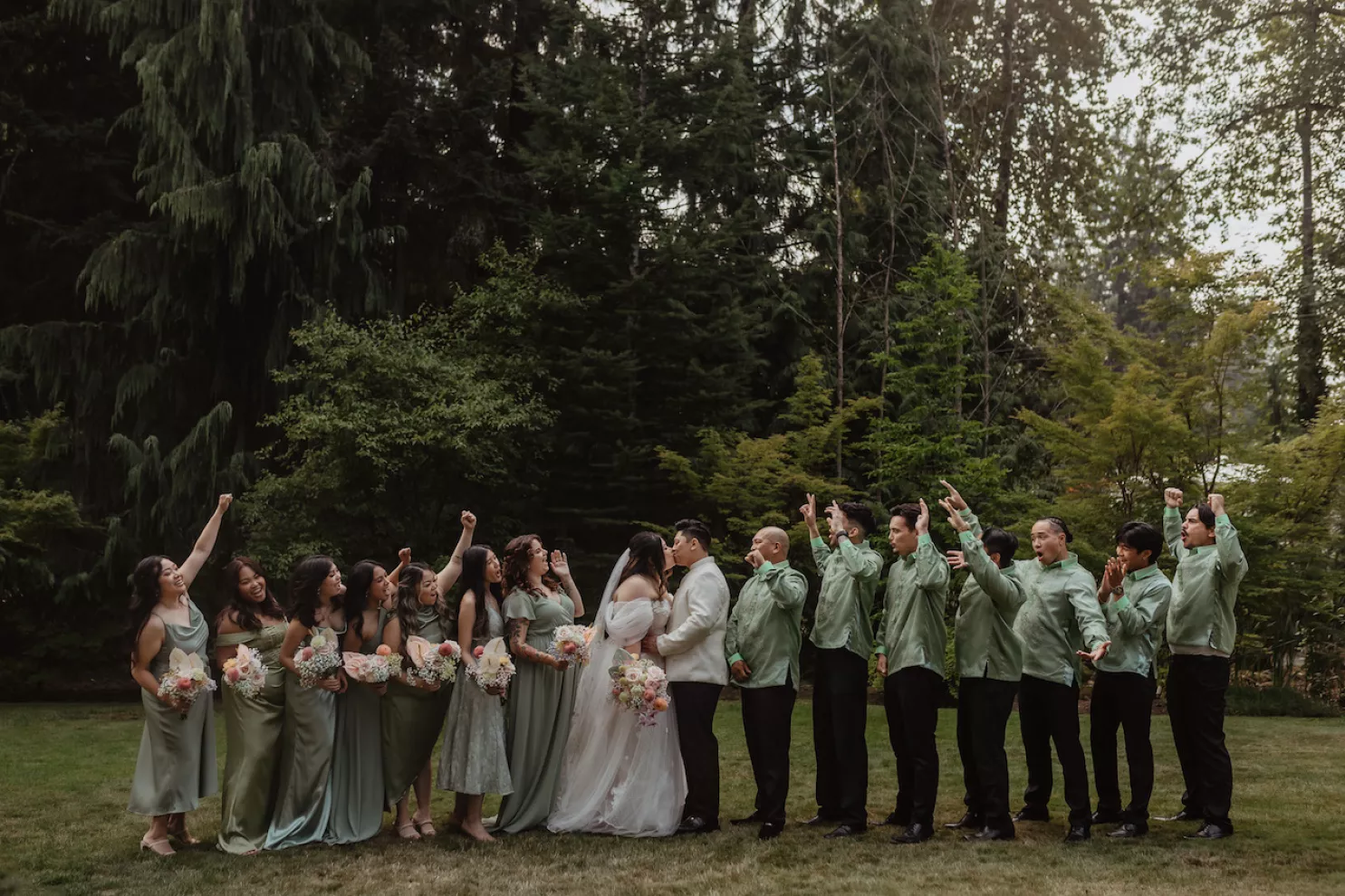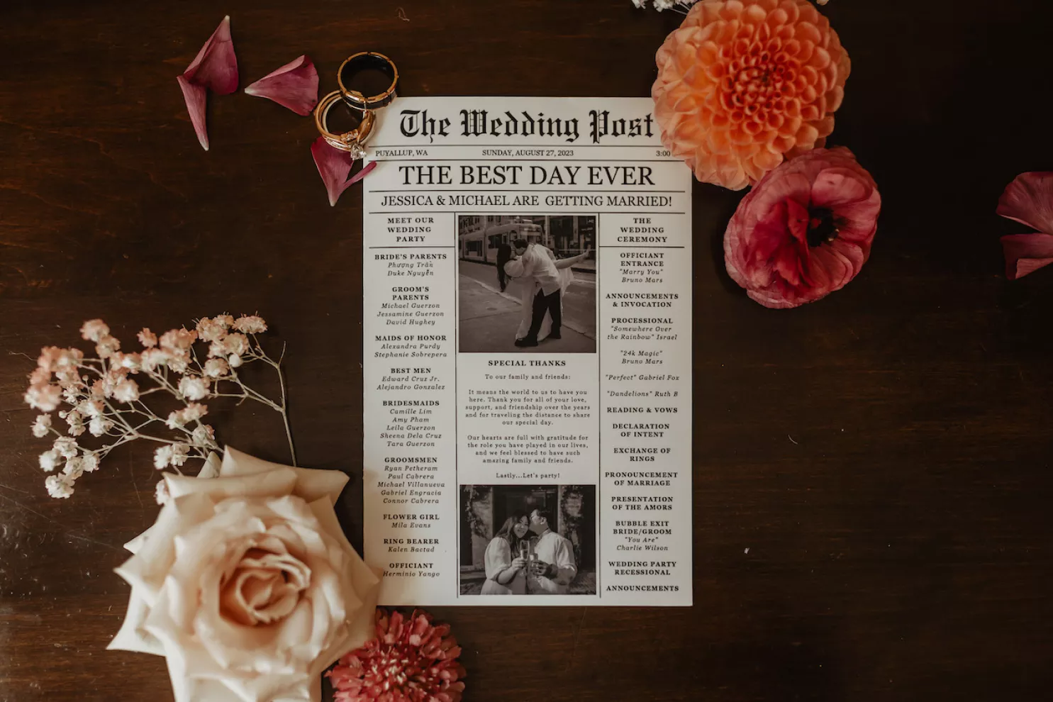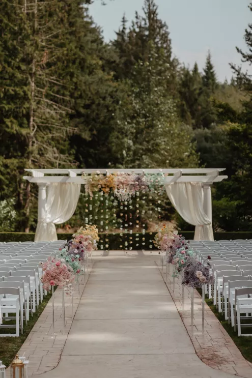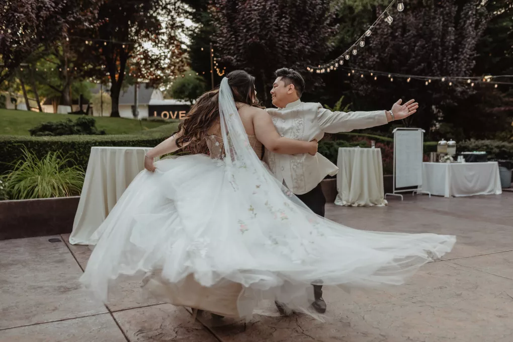 Jessica and Michael’s love story began with a ring pop and Bruno Mars. The couple first met at a Seattle music and dance event, where he was performing with his band, and she was dancing with her company. Michael pulled Jessica on stage, serenading her to “Marry You” and handing her a ring pop as part of the bit. Five years of friendship and performances across Washington followed before the two started dating. Because music was a constant in their relationship, it shaped nearly every moment of their day, from the sentimental songs they chose to the live performances by friends and family.