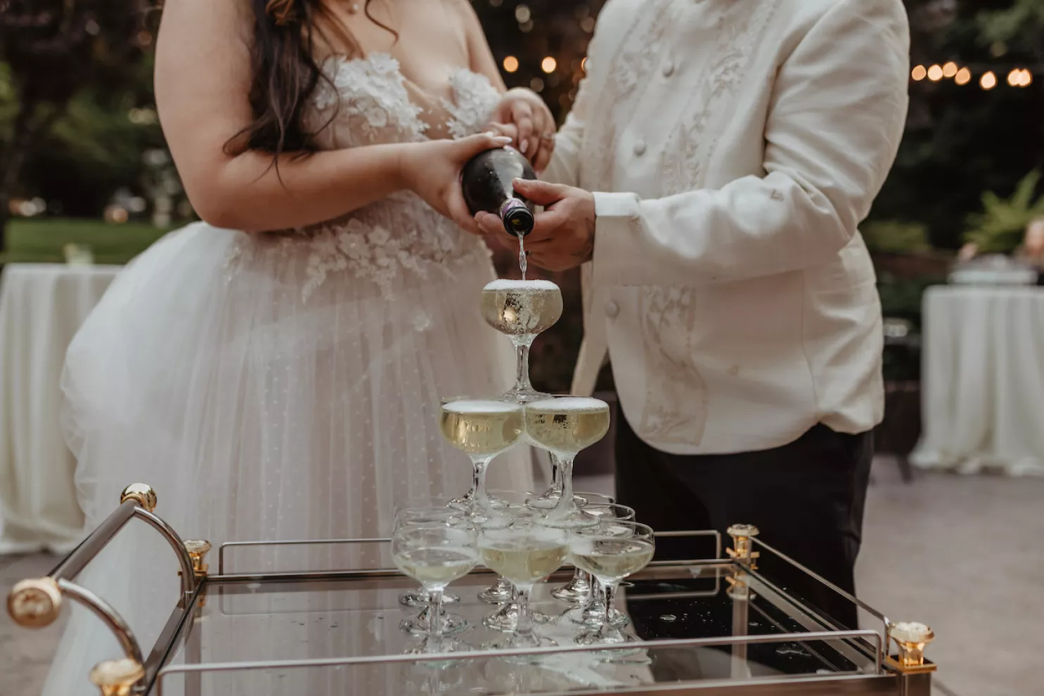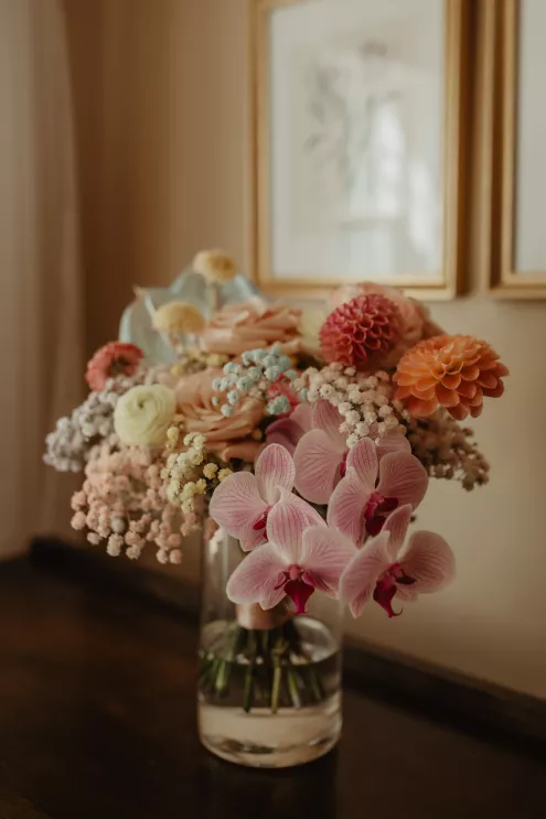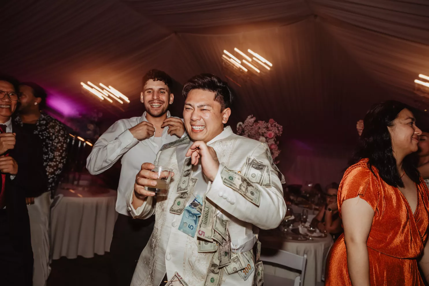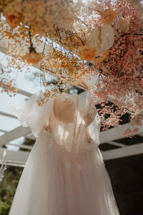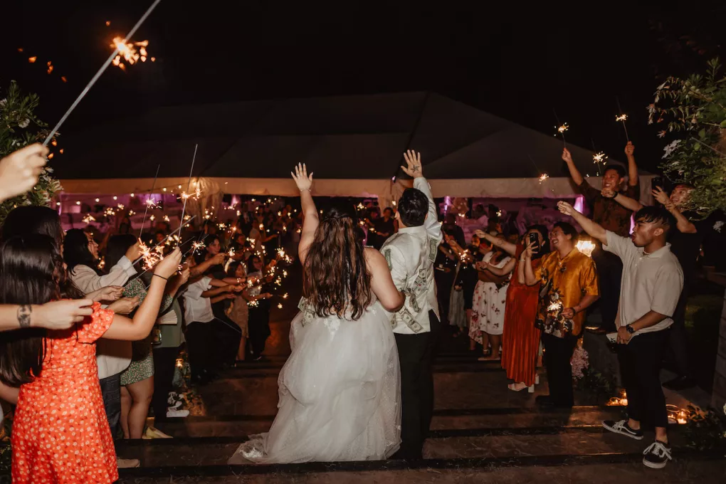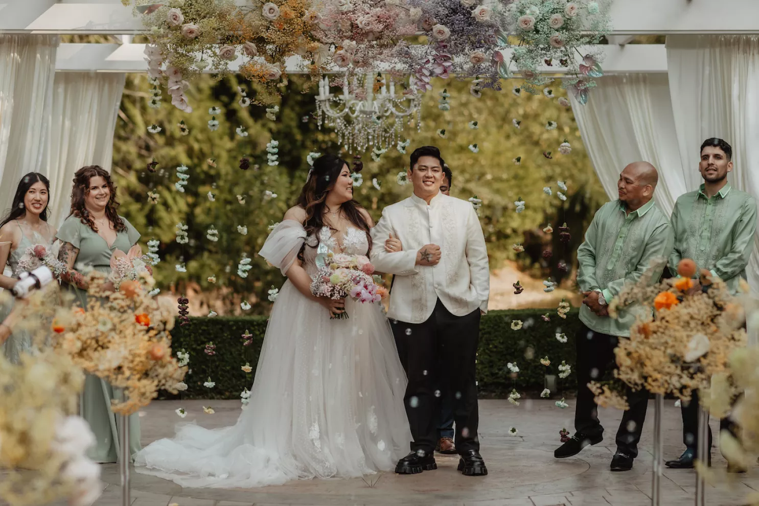 The celebration spanned two days. The first was a traditional Vietnamese tea ceremony at Jessica’s childhood home, where the groom’s family arrived bearing gifts on traditional gold trays, and the couple served tea to their elders in a ritual of gratitude and blessing. The second day opened with an ethereal, colorful pastel garden party at Rock Creek Gardens. The officiant danced down the aisle, the groom performed, the best man sang the first dance, Filipino lechon was carved at dinner and a boba wall at cocktail hour gave way to a late-night ramen bar before the night was through. From start to finish, the day was jubilant and perfectly in tune.