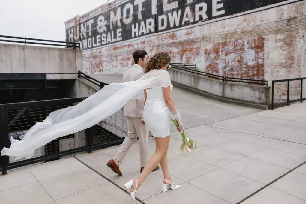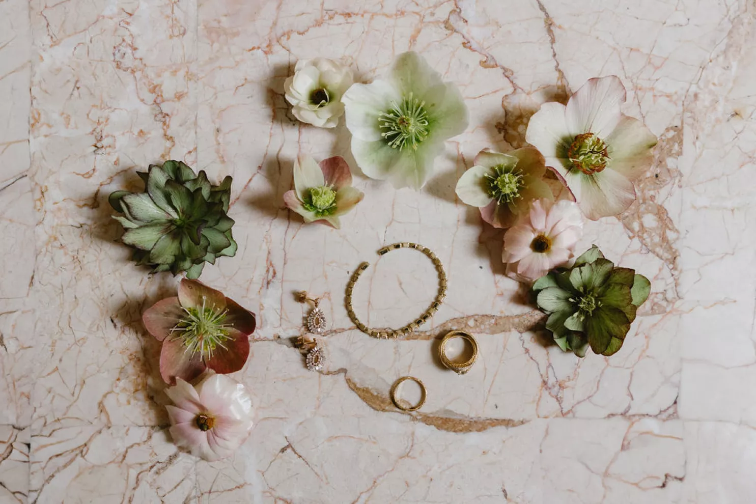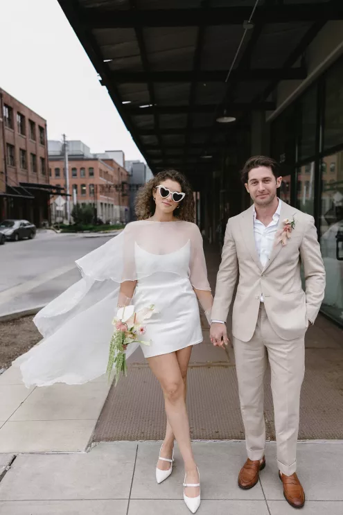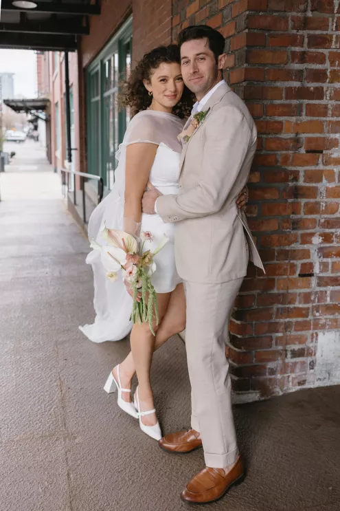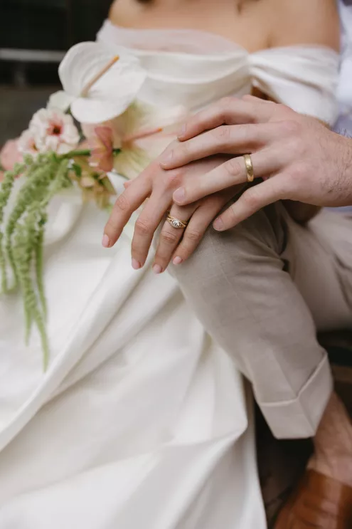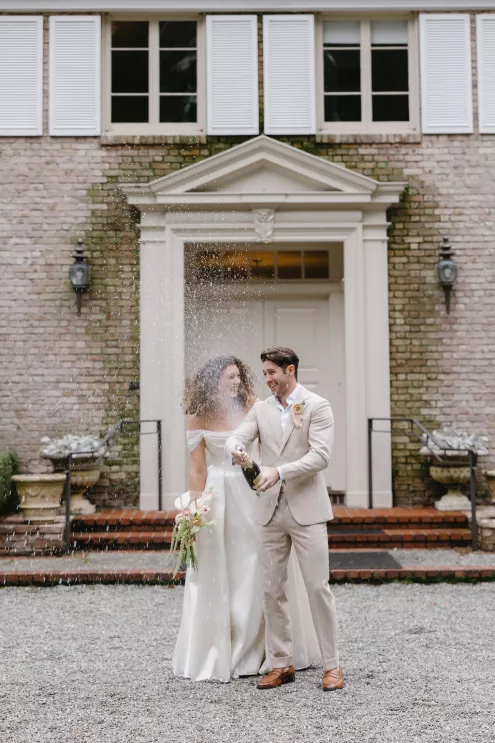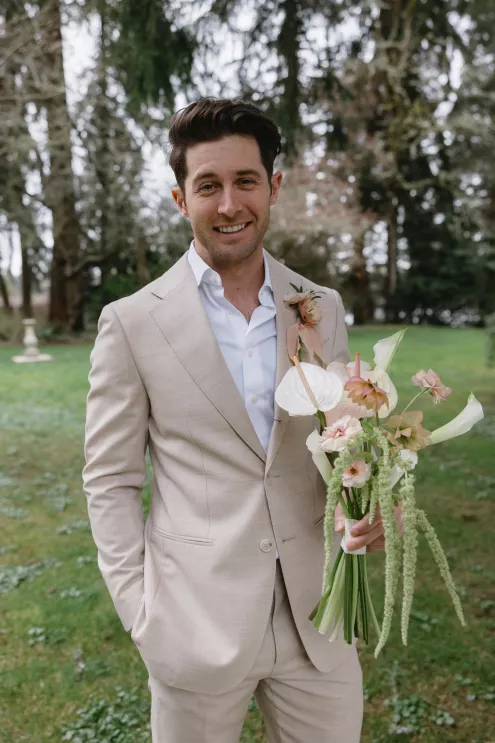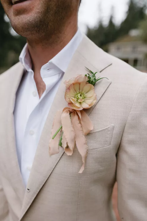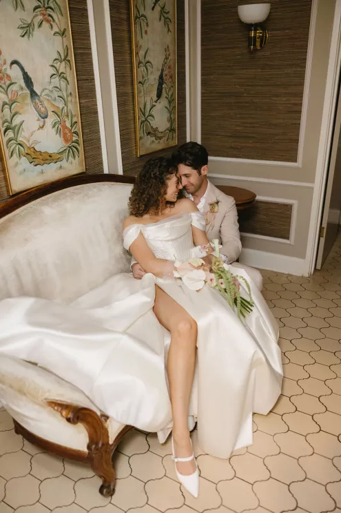 In the picture of European romance, the bride was dressed in a corseted ball gown from Sarah Seven, with pearl-embellished tulle gloves for an added layer of femininity. The groom was dressed in a light-colored suit, with his boutonniere featuring a frayed ribbon that matched the peach-and-pink color scheme, adding a vintage touch to his look.
