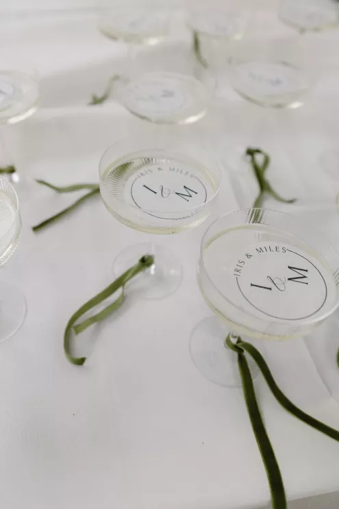 As a treat for guests, monogrammed edible cocktail toppers were added to the champagne coupes, along with velvet ribbons, creating both a fun treat and a memorable addition to the party. Thoughtfully pairing natural beauty with touches of traditionality and whimsy brought together a European-inspired wedding in the heart of Washington.