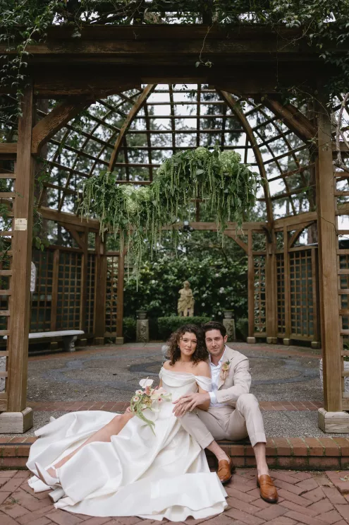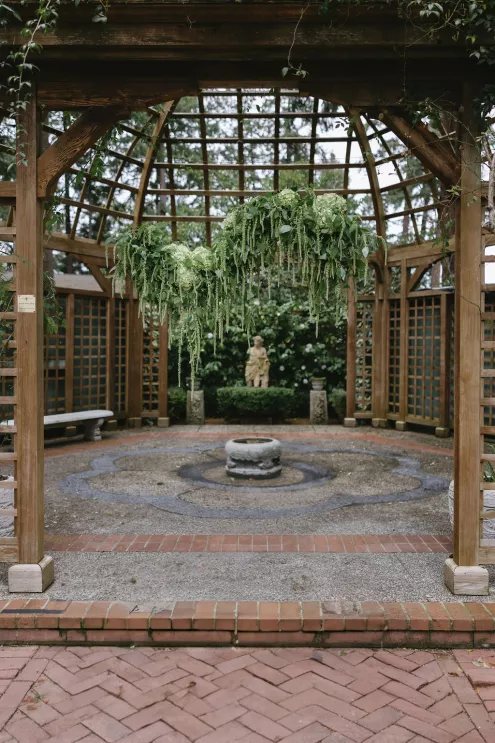 Leaning into the venue's natural beauty, the florals were kept sparse and unique, with anthuriums sprouting from moss saucers as tablescapes, interspersed with tea light votives. A show-stopping floral hanging installation hung beneath the domed pergola, adding a touch of natural whimsy to the stunning gardens.