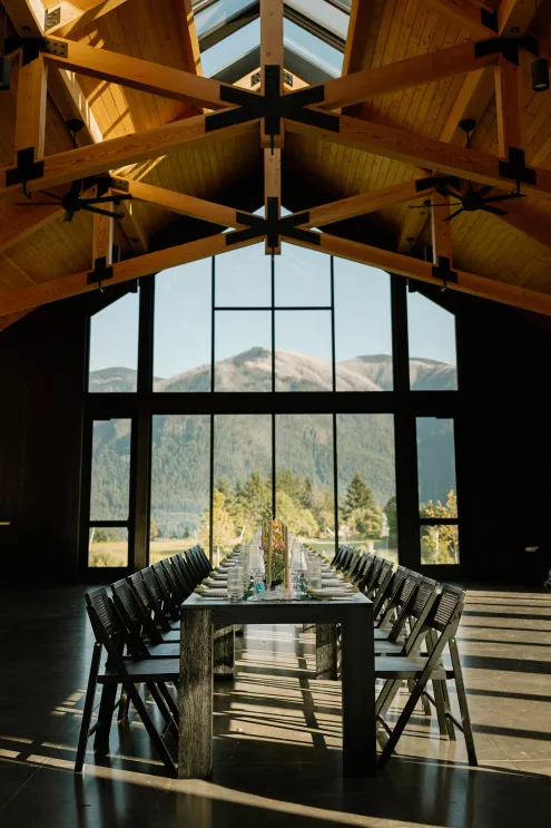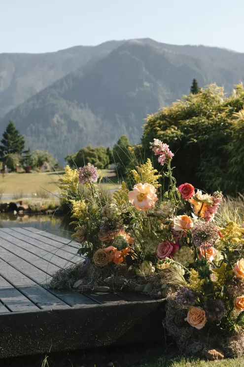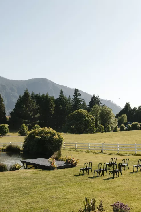 This waterside design was built around contrast—crisp black-tie attire against an open summer landscape and a lively spring palette woven through the modern architecture of Wind Mountain Ranch in Stevenson. The stunning scene was crafted by Seattle-based wedding planning and design company Bixby + Pine.