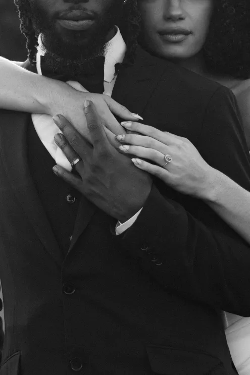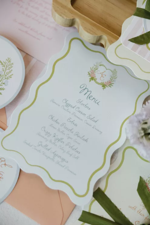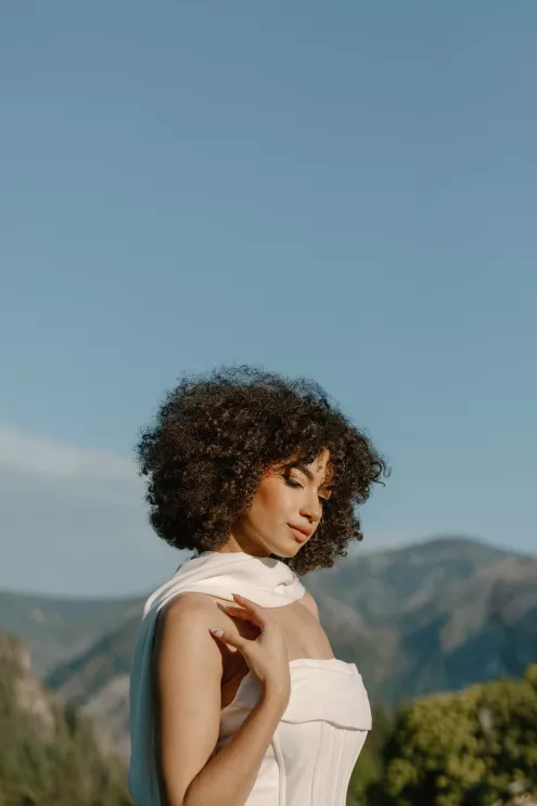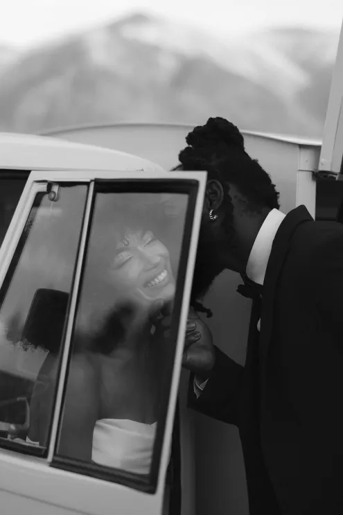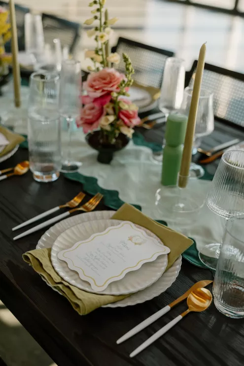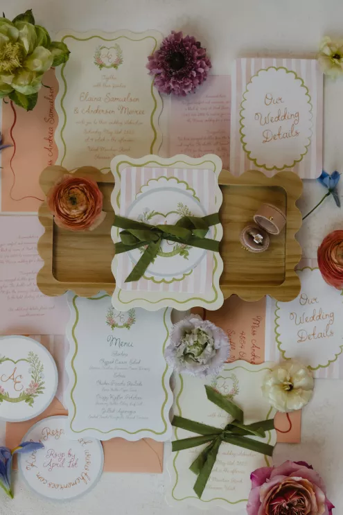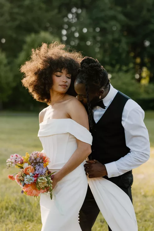 Outside, the ceremony came alive. The ridgelines surrounding the property created a natural frame for a small, seated group, while blooms in chartreuse, lilac, orange and soft blue added sculptural color along the pond’s edge. The vow exchange, though imagined, carried the intimate pace of a true micro-wedding—guests, some sporting parasols to contend with the golden-hour sun, looked on. The bride’s veil caught the wind as her groom dipped her into an “I do” kiss.
