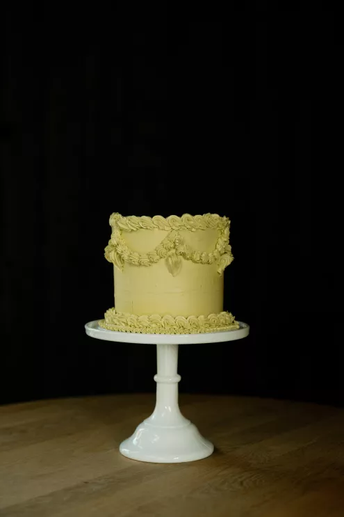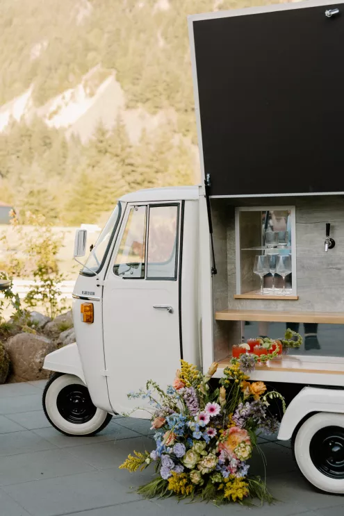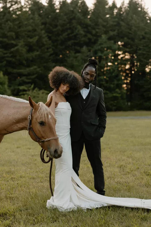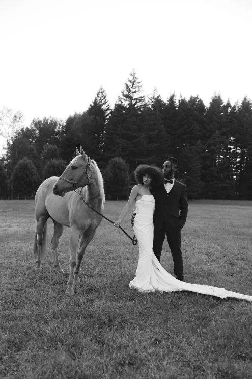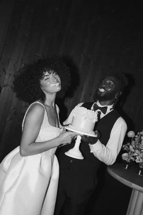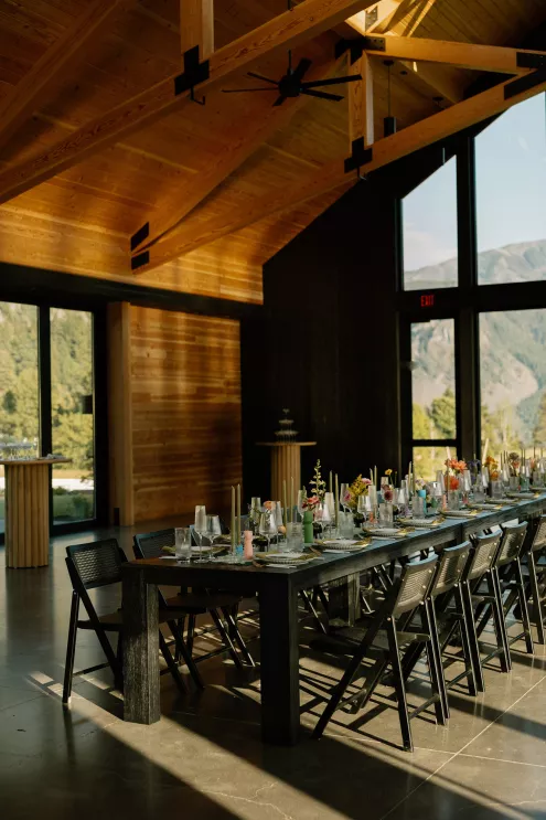 For cocktails, servers passed elevated, seasonal bites. A vintage beverage cart offered a playful moment against the ranch’s black-timber interior. Dinner followed inside the barn, where “Ikebana-style arrangements on the table created a unique and visually interesting setting,” says Bixby + Pine owner and creative director, Taylor Rychener. The day wound down with a single-layer Lambeth cake, an indulgent champagne tower and golden light falling across the grounds.